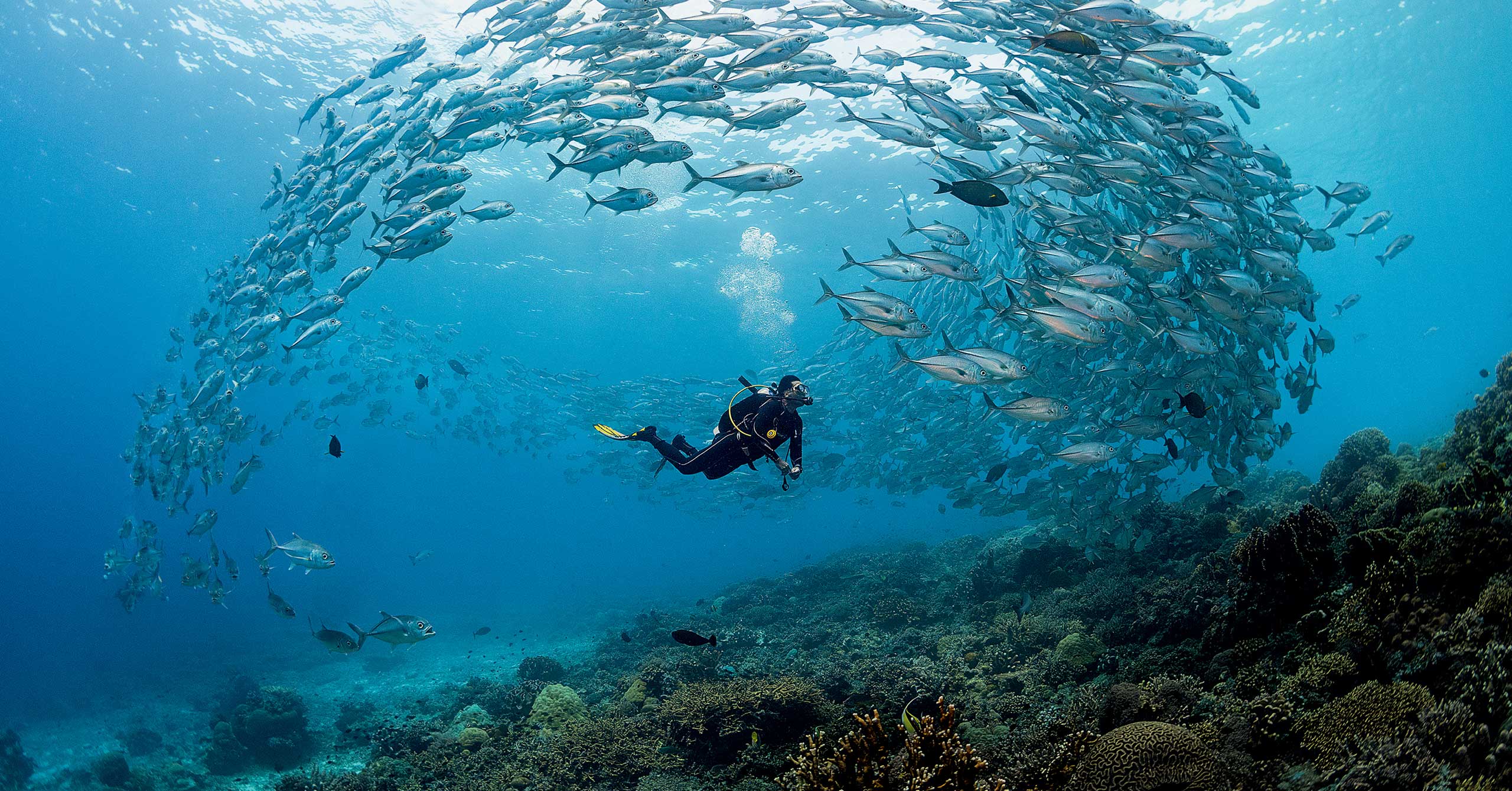 Tubbataha is home to pristine reefs that are composed of over 360 species of coral and provide a home to close to 600 species of fish. Divers regularly encounter reef and pelagic sharks and rays, swim with sea turtles, and witness pods of dolphins, an experience that represents the best of what the Coral Triangle has to offer. Meanwhile, Bird Islet can be found above the North Atoll, providing a crucial nesting ground for migratory seabirds.