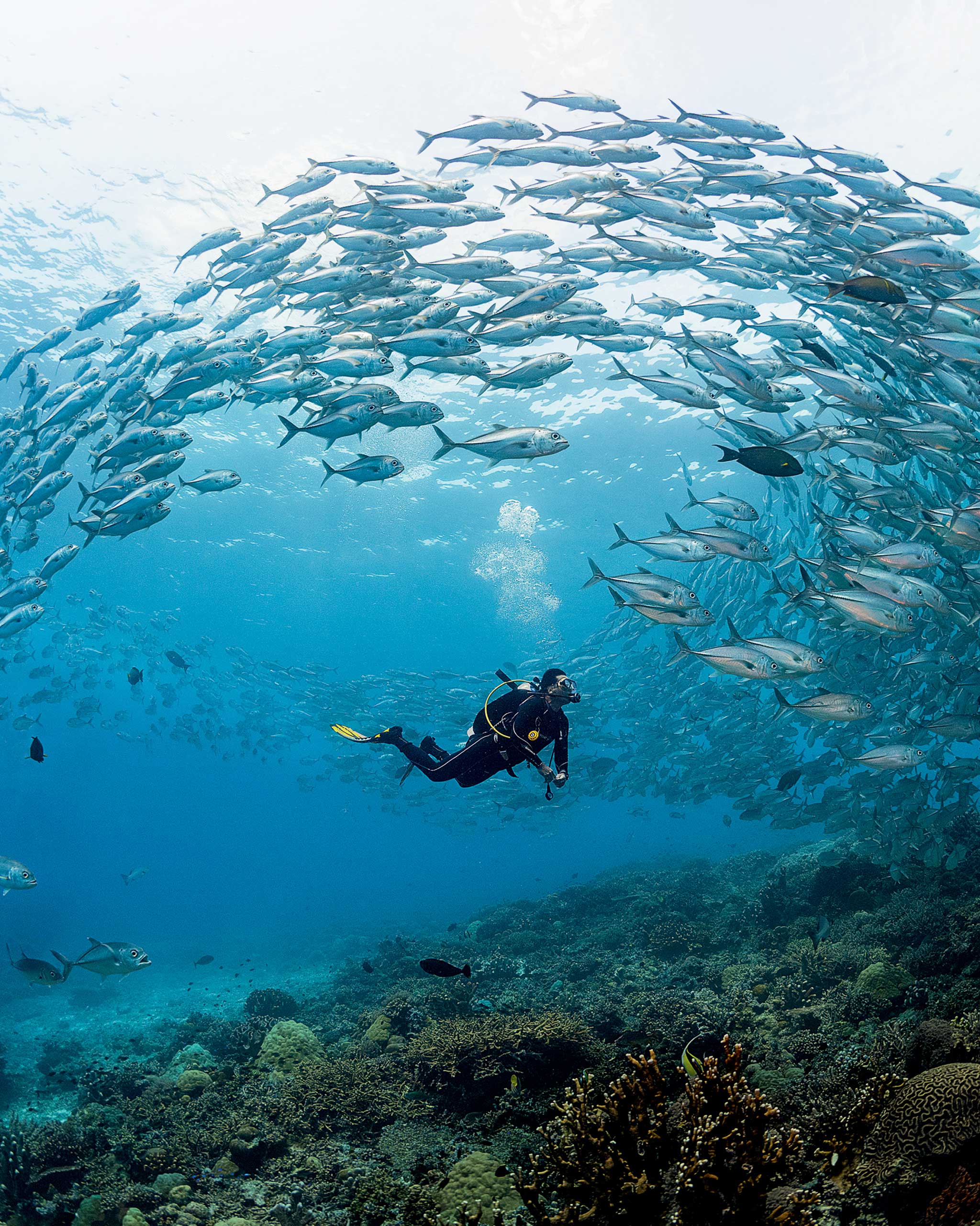 Tubbataha is home to pristine reefs that are composed of over 360 species of coral and provide a home to close to 600 species of fish. Photographed by Noel Guevara for the April 2025 Issue of Vogue Philippines