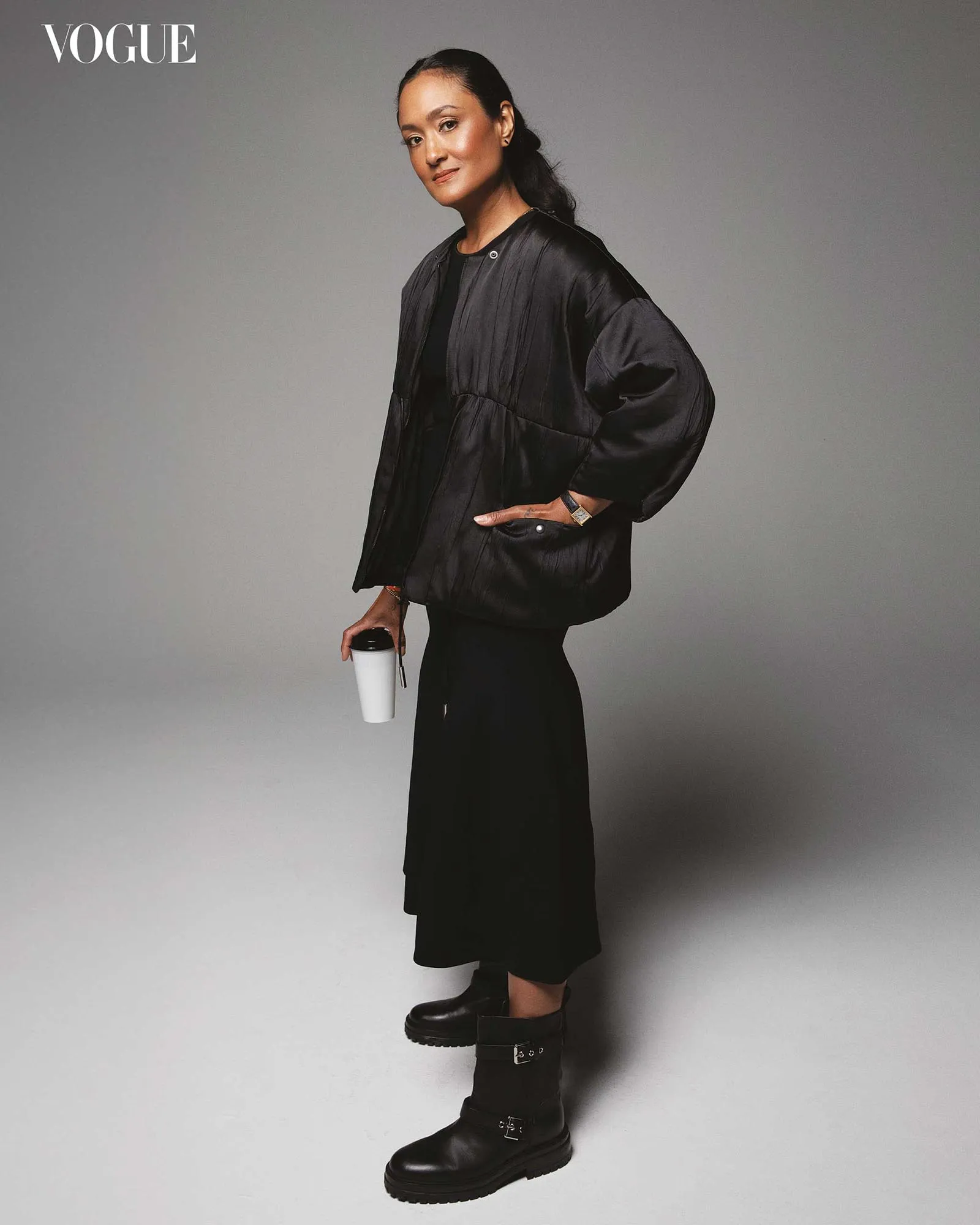 HERMÈS jacket, turtleneck, and leggings, MICHAEL KORS COLLECTION boots, talent’s own jewelry and watch. Photographed by ROMER PEDRON for the October 2025 Issue of Vogue Philippines