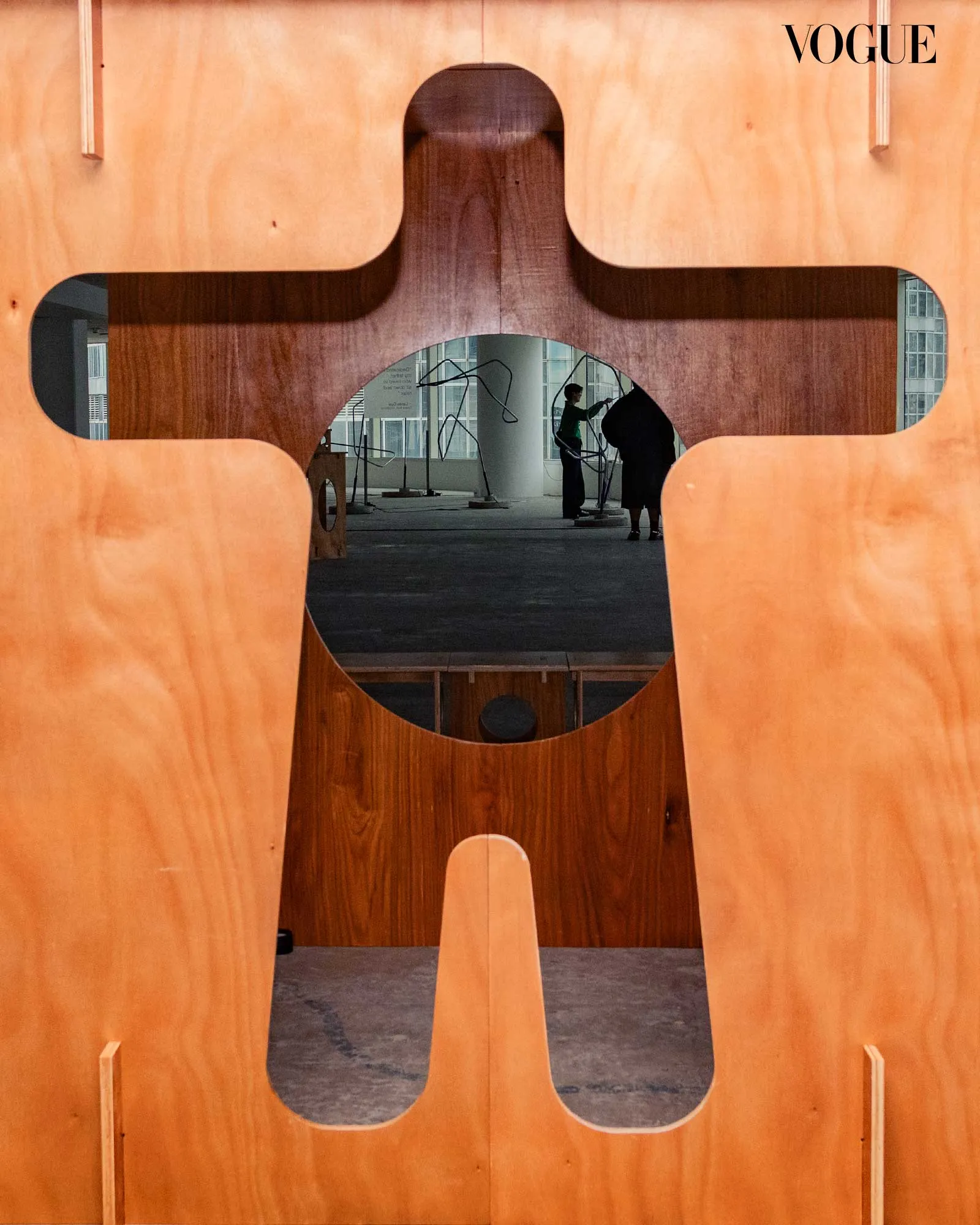 A short pause is then offered with architect Lando Cusi’s series of works, dedicated in memory of his father. Even at rest, the artist plays with scale and proportion through a collection of wooden furniture called Take a Seat, Goldilocks. Each piece’s design starts with the typical dimension of a stool, but once it’s stretched out, shrunken down, or manipulated in varying ways, it serves a different purpose. A stool becomes a table, becomes a bench, becomes a pedestal with small but defining changes. In one area, a large piece called “Papa Bear & Baby Bear” creates an abstraction of the Vitruvian man as guests walk through the cut-out shapes.