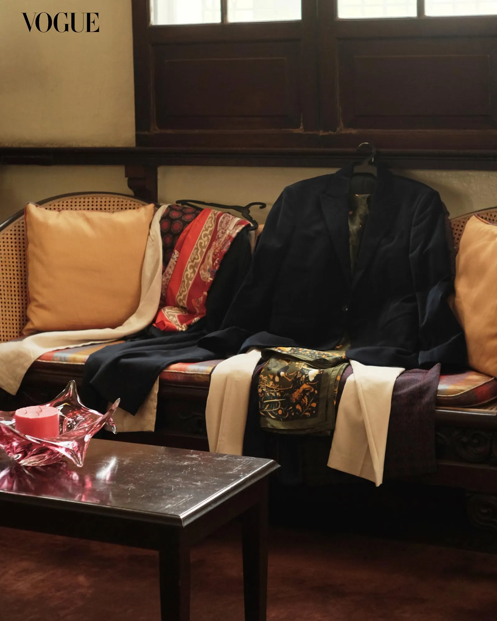 Santos shares his favorite parts of the shoot: “I loved the sudden inspiration moments: the discovery of a big and very precious mural hidden behind the drapes and of a very confident and elegant ‘camera-ready’ dog willing to strike a pose with me,” he says. He also read aloud Shakespeare’s Sonnet 29, a piece that is close to his heart.