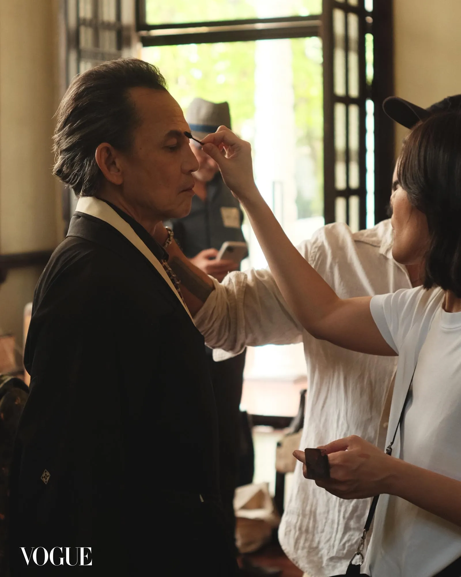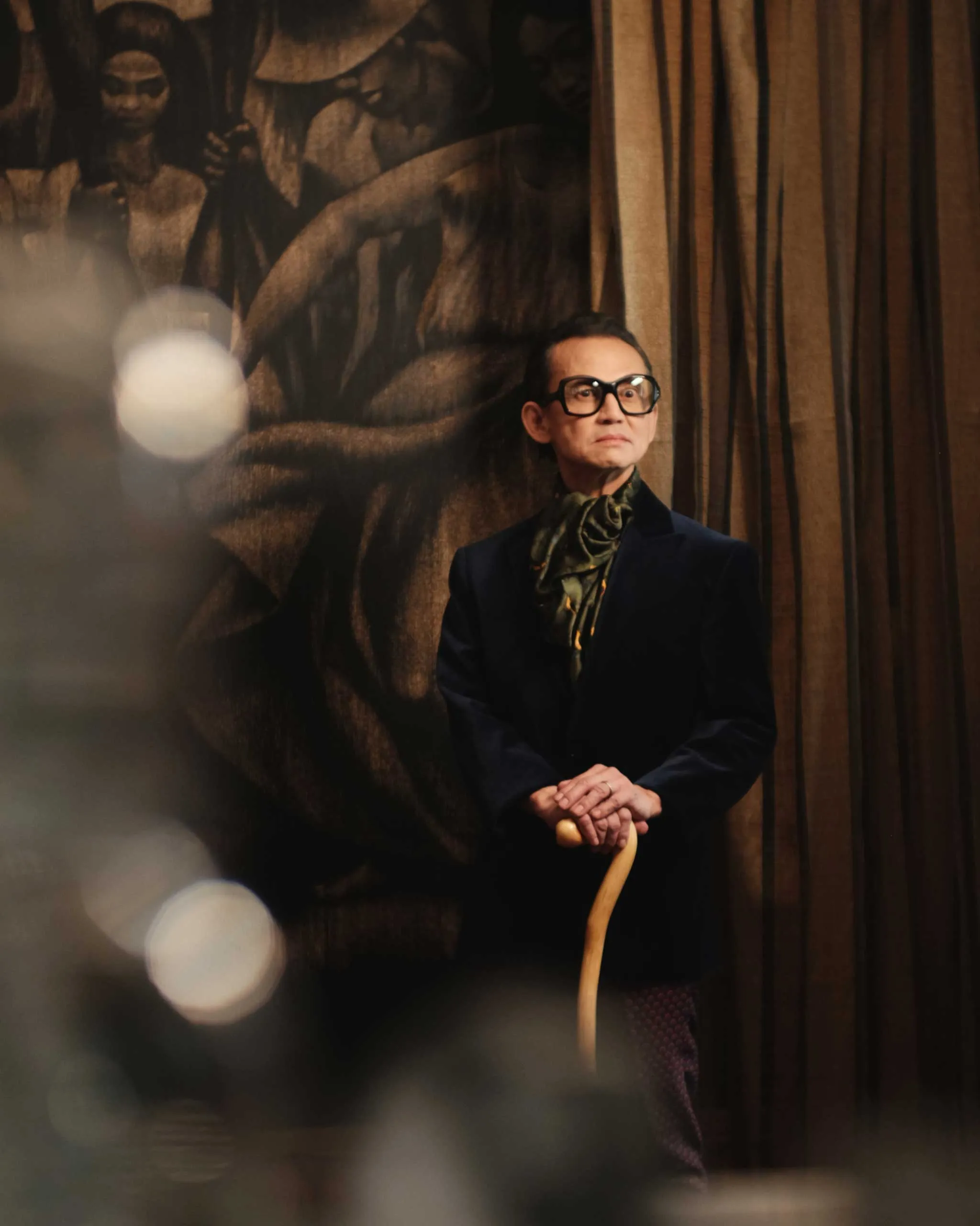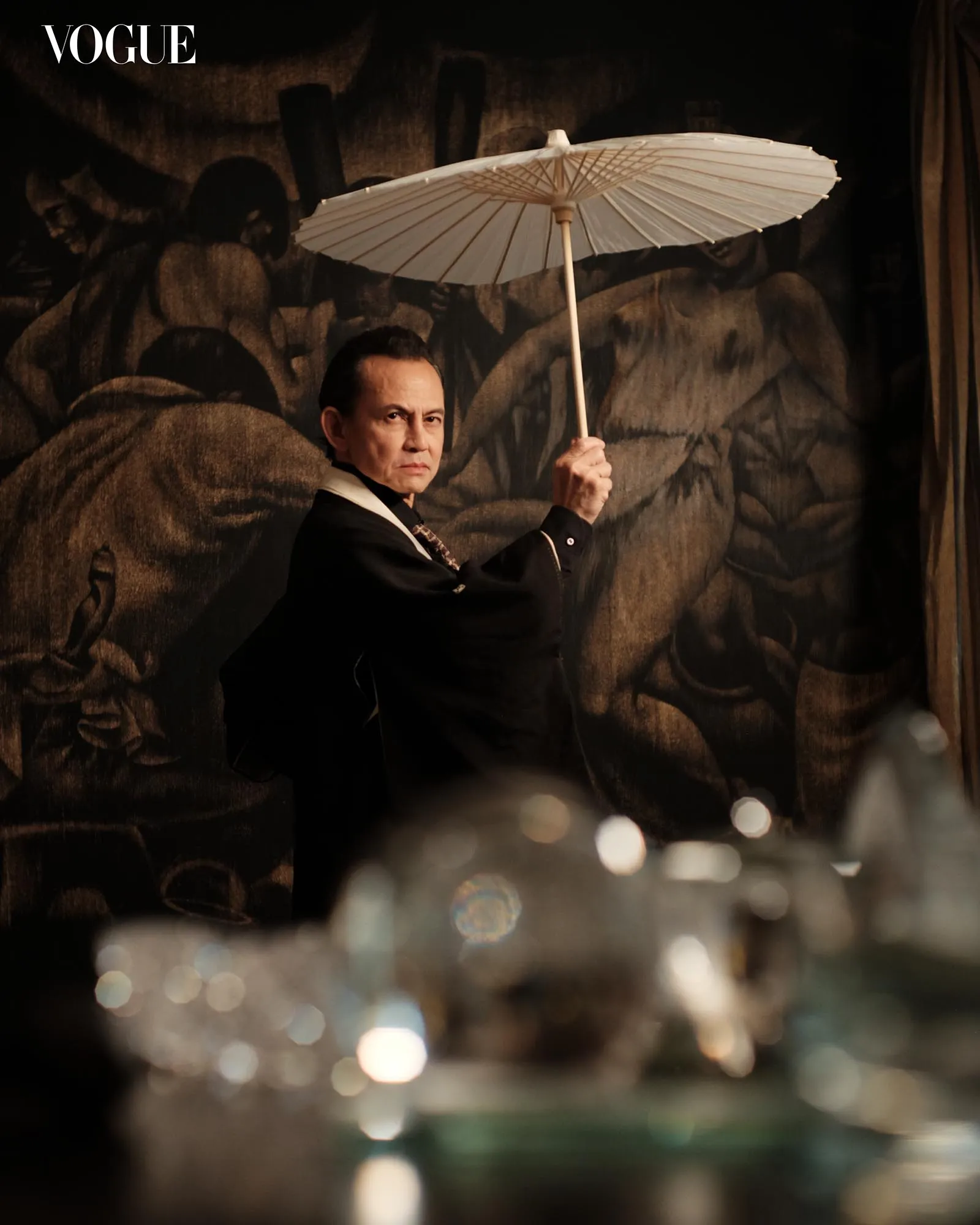 Lastly, Quiñones describes the last archetype as “the dandy in a world of whimsy, offering a sense of wonder and playfulness. Shot next to the “Binasuan Mural,” by Carlos “Botong” Francisco, Santos wears a vintage kimono, reminiscent of an Edo-dandy. “We wanted to place him in a scene that reveals his place in the industry,” Quiñones adds. “This was a way to create the dialogue between the greats.”