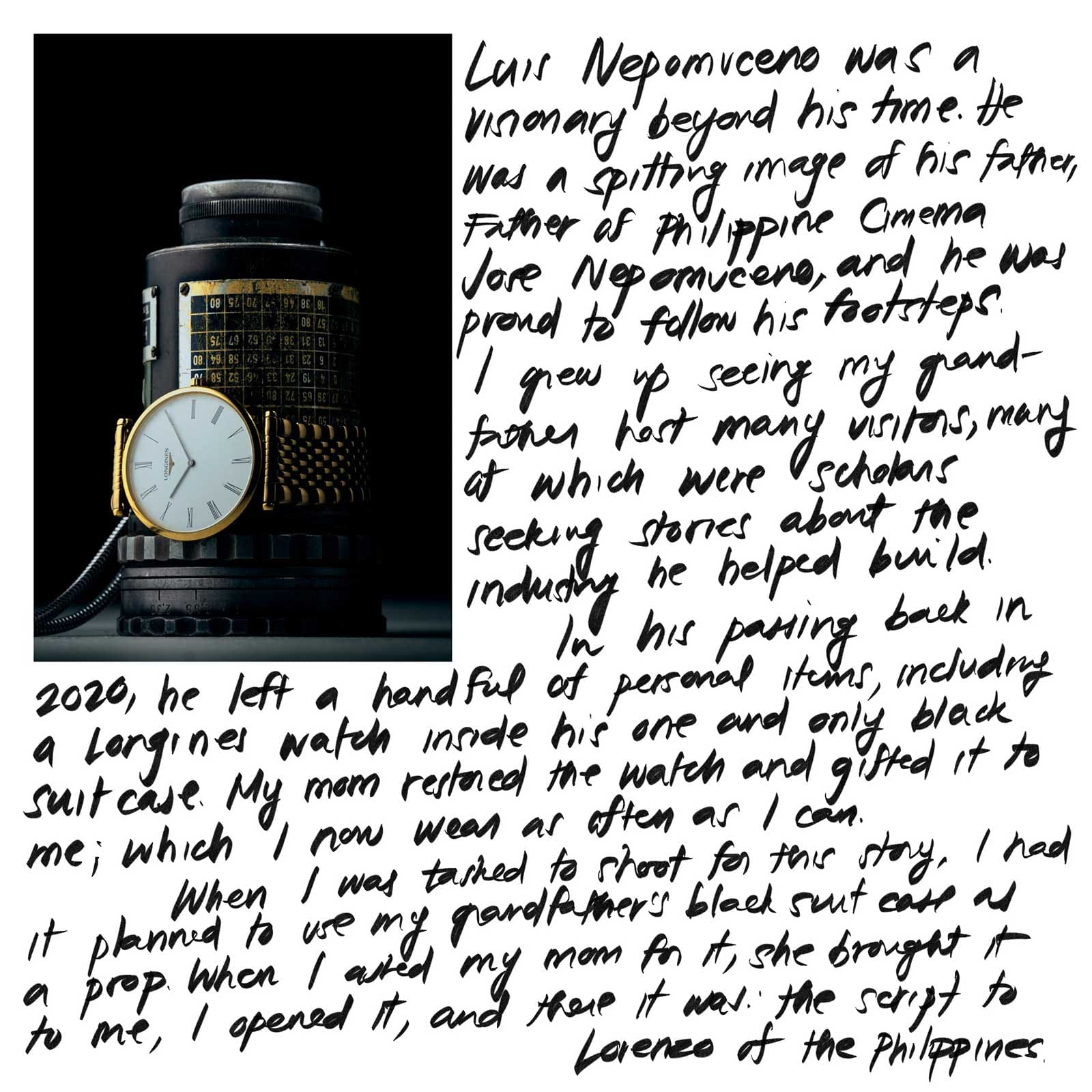 In his passing back in 2020, he left a handful of personal items, including a Longines watch inside his one and only black suitcase. My mom restored the watch and gifted it to me, which I now wear as often as I can.