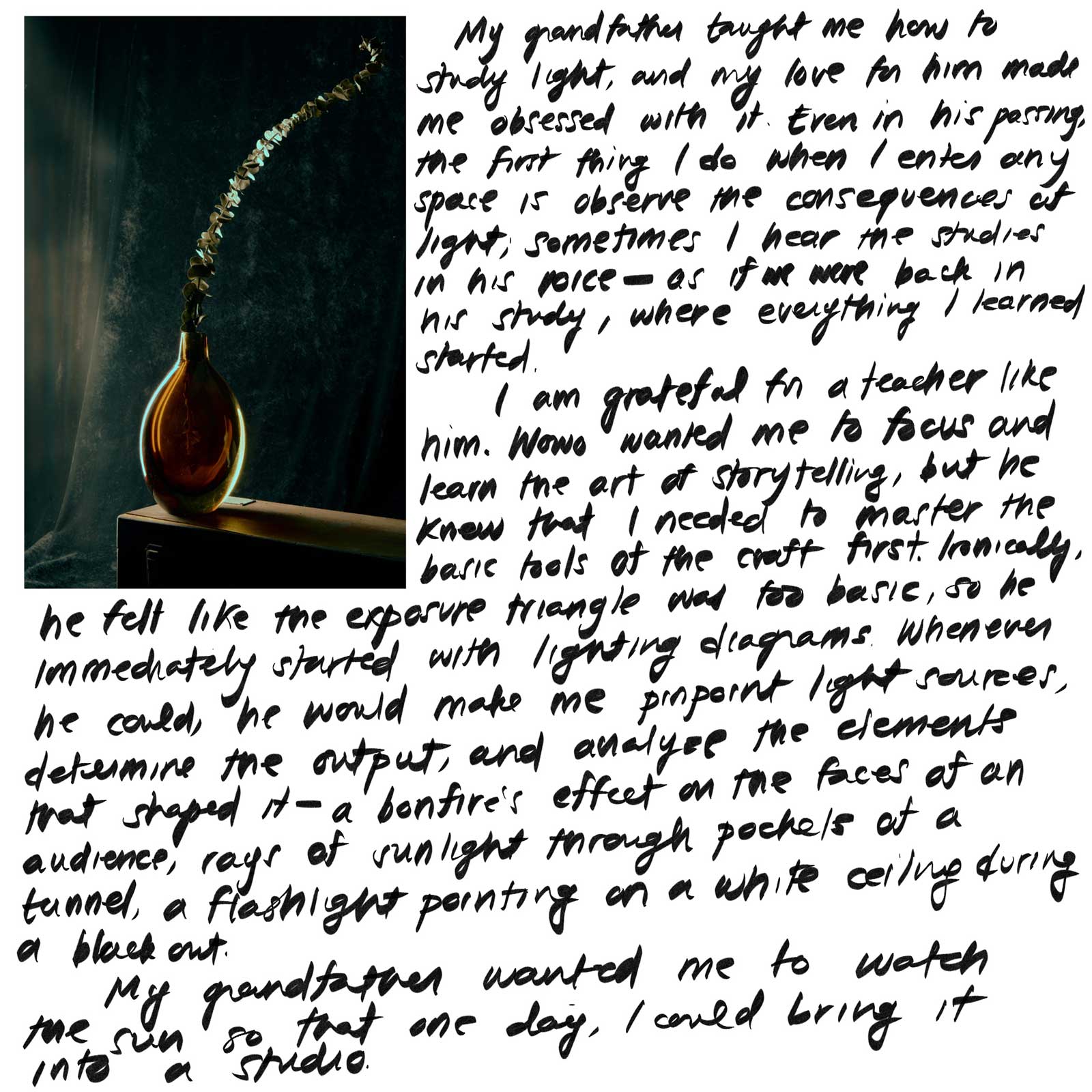 ARTU NEPOMUCENO: My grandfather taught me how to study light and my love for him made me obsessed with it. Even in his passing, the first thing I do when I enter any space is observe the consequences of light; sometimes I hear the studies in his voice—as if we were back in his study, where everything I learned started.