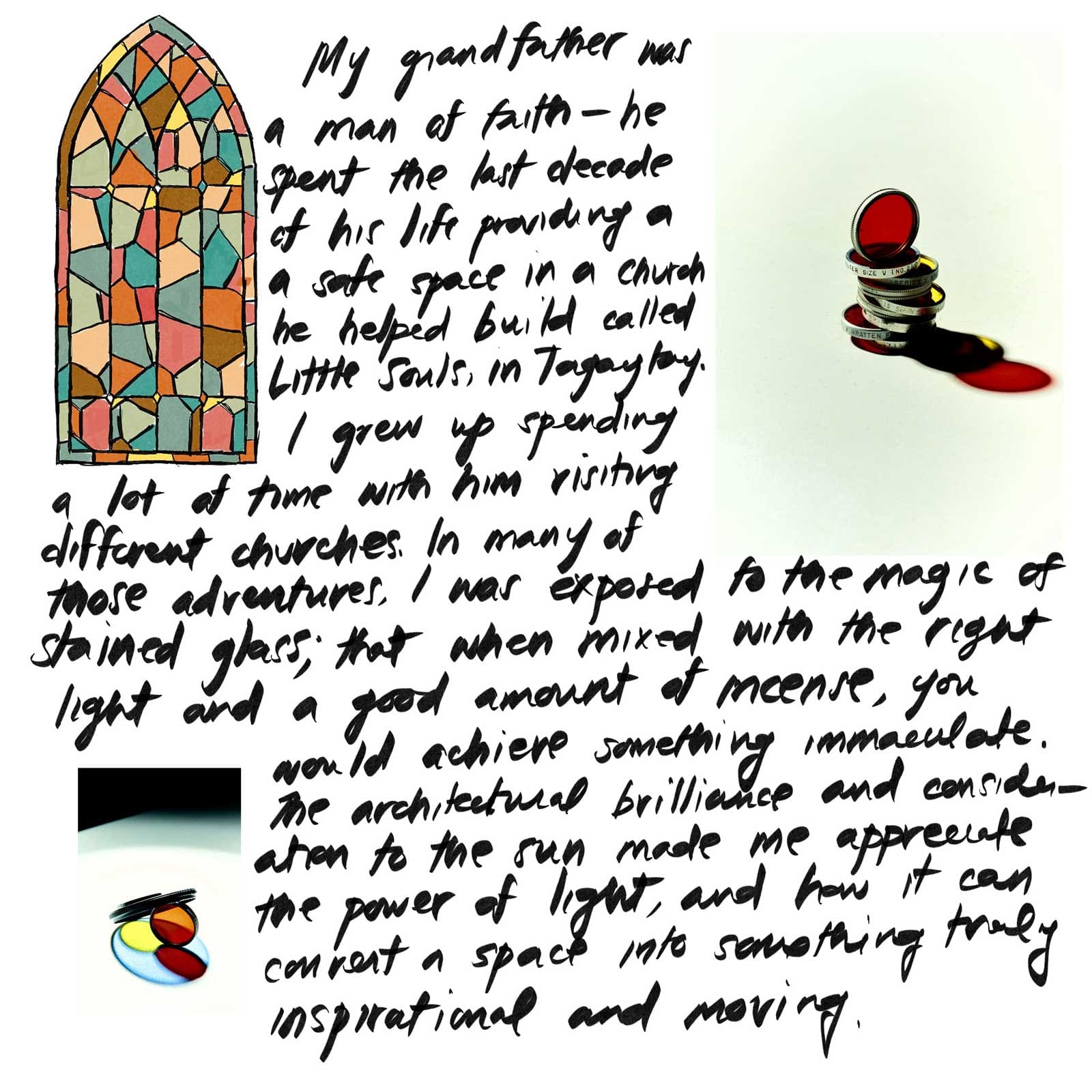 My grandfather was a man of faith—he spent the last decade of his life providing a safe space in a church he helped build called Little Souls in Tagaytay. I grew up spending a lot of time with him visiting different churches. In many of those adventures, I was exposed to the magic of stained glass; that when mixed with the right light and a good amount of incense, you would achieve something immaculate. The architectural brilliance and consideration to the sun made me appreciate the power of light and how it can convert a space into something truly inspirational and moving.