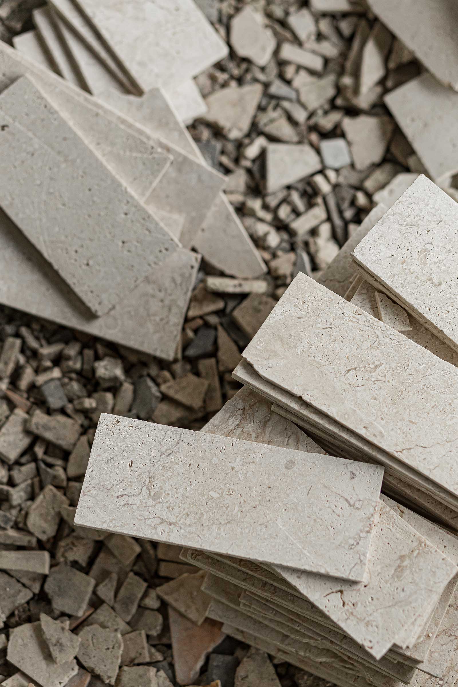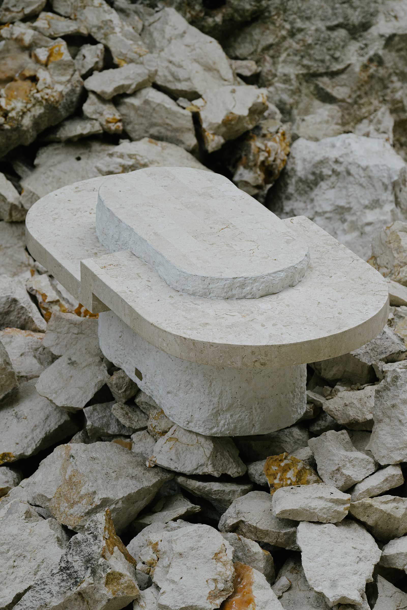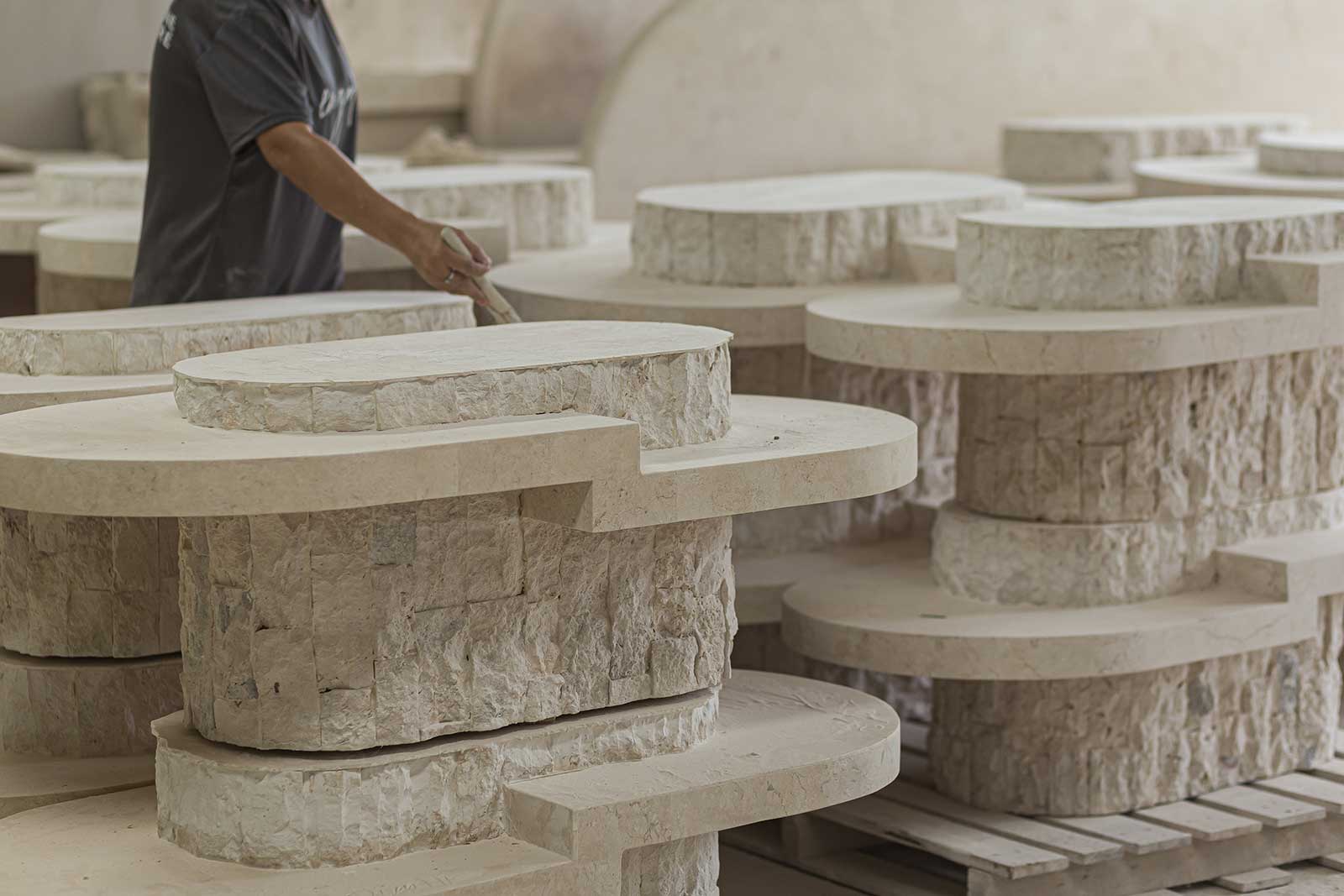 The limestone is ancient, chalky and porous, and on its surfaces you can see skeletal traces of marine organisms like coral and mollusks. After being cut into chunks, the stone is carved into tiles. At the carpentry workshop, wood and fiberglass molds are created, on which pieces of the stone are set. The artisan then sands and shapes the tile to fit the form. Each piece is unique with its different markings, from the natural irregularities of an organic sediment built up over millennia, to the manual finishing touches done by hand.