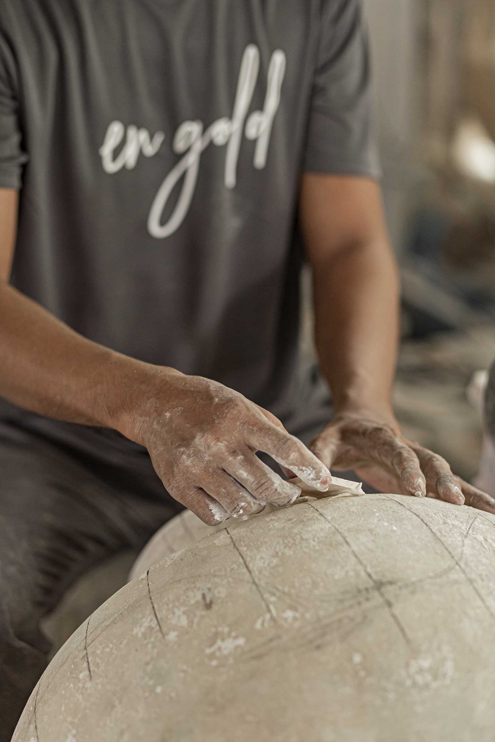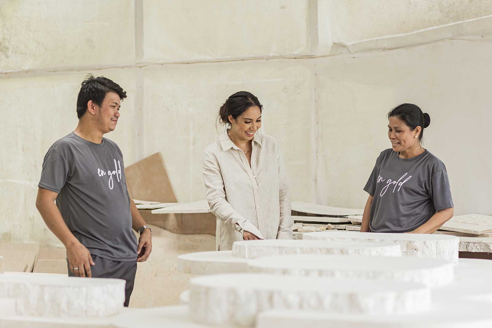 With limestone being a finite resource, Steffanie ensures that nothing goes to waste. “I saw the wastage in some of the stone masonry workshops, and there was just so much stone getting thrown away because of cracks and things like that,” she says. “But in ours, we carve the stone into tiles so every last piece of the stone is used, and if you get a crack, it’s okay because you can reshape that tile and still use it.” En Gold has begun to use these little chips in its new Stonecast outdoor collection, where the bits and pieces have been powdered down to create a putty that can be rendered and laid over the furniture piece. “We’ve got such minimal waste, we’re able to utilize every last piece. I think that’s something that’s quite innate to Filipino culture, right?”