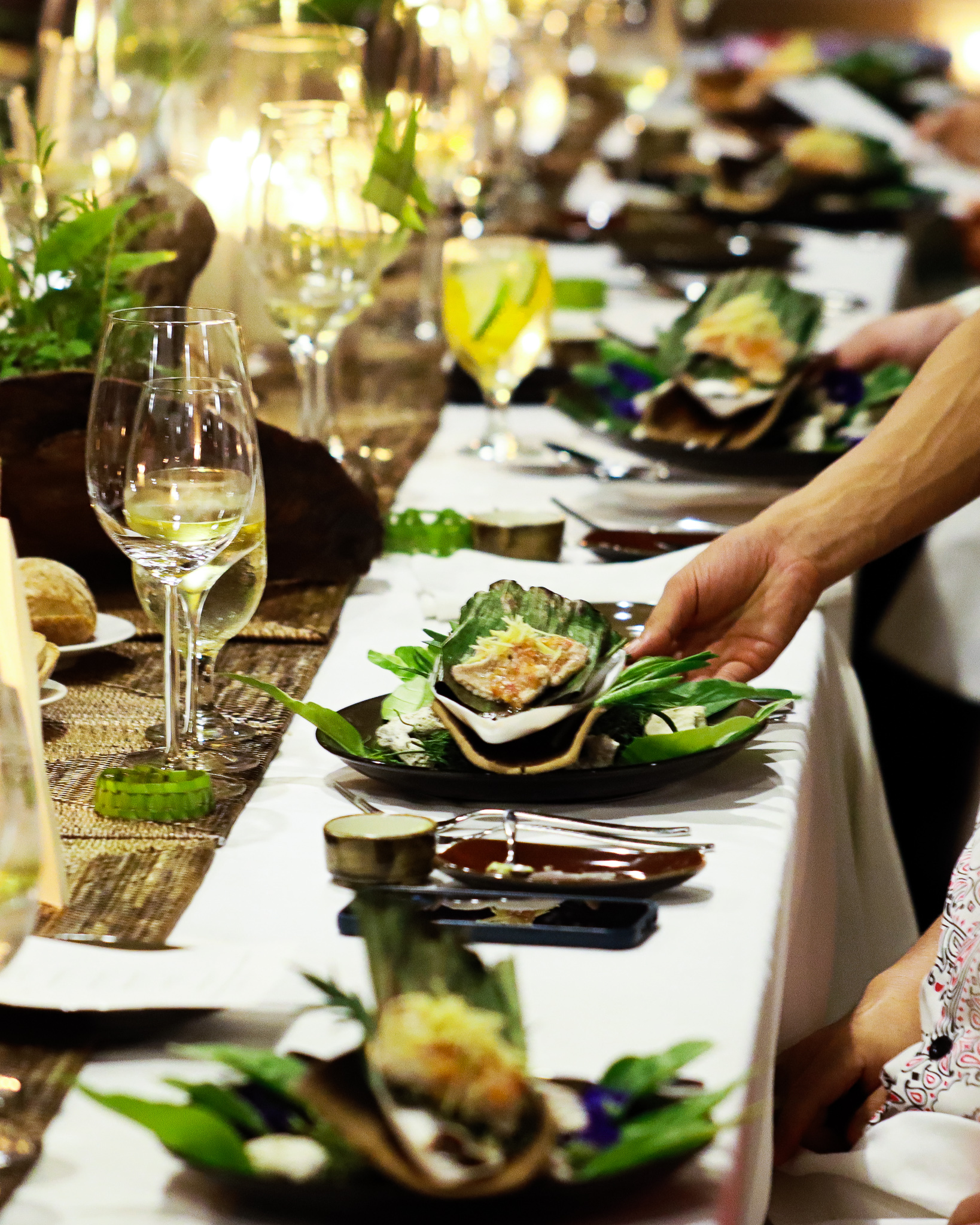 “Across Oceans” wed Filipino and Maldivian cuisine in a union bound by the commitment to freshness and seasonality characteristic of New Nordic techniques. Guests began the evening by torchlight on the shore. There, they partook of Maldivian apéritifs and hors d’oeuvres to set a baseline for a cuisine new to many. A highlight was the kulhafila, a light fern salad served in a sea urchin shell.