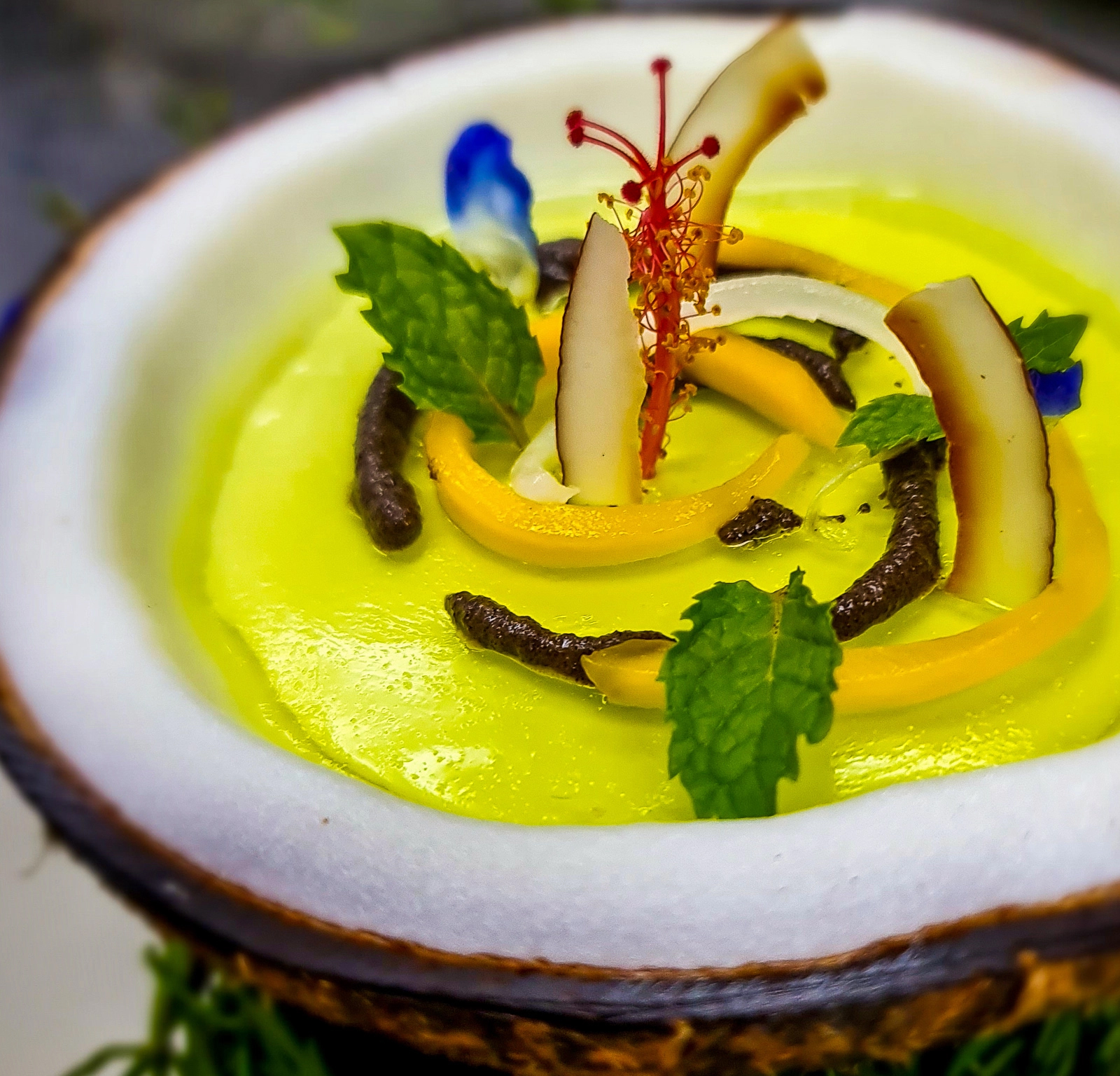 Dinner ended with a coconut panna cotta with papaya seed salsa. Delightful and deceptively healthy, eating straight out of a coconut resting atop a bed of island vines evoked the intimate relationship between food and the natural world. As the festivities concluded, song and dance made for an excellent digestif.