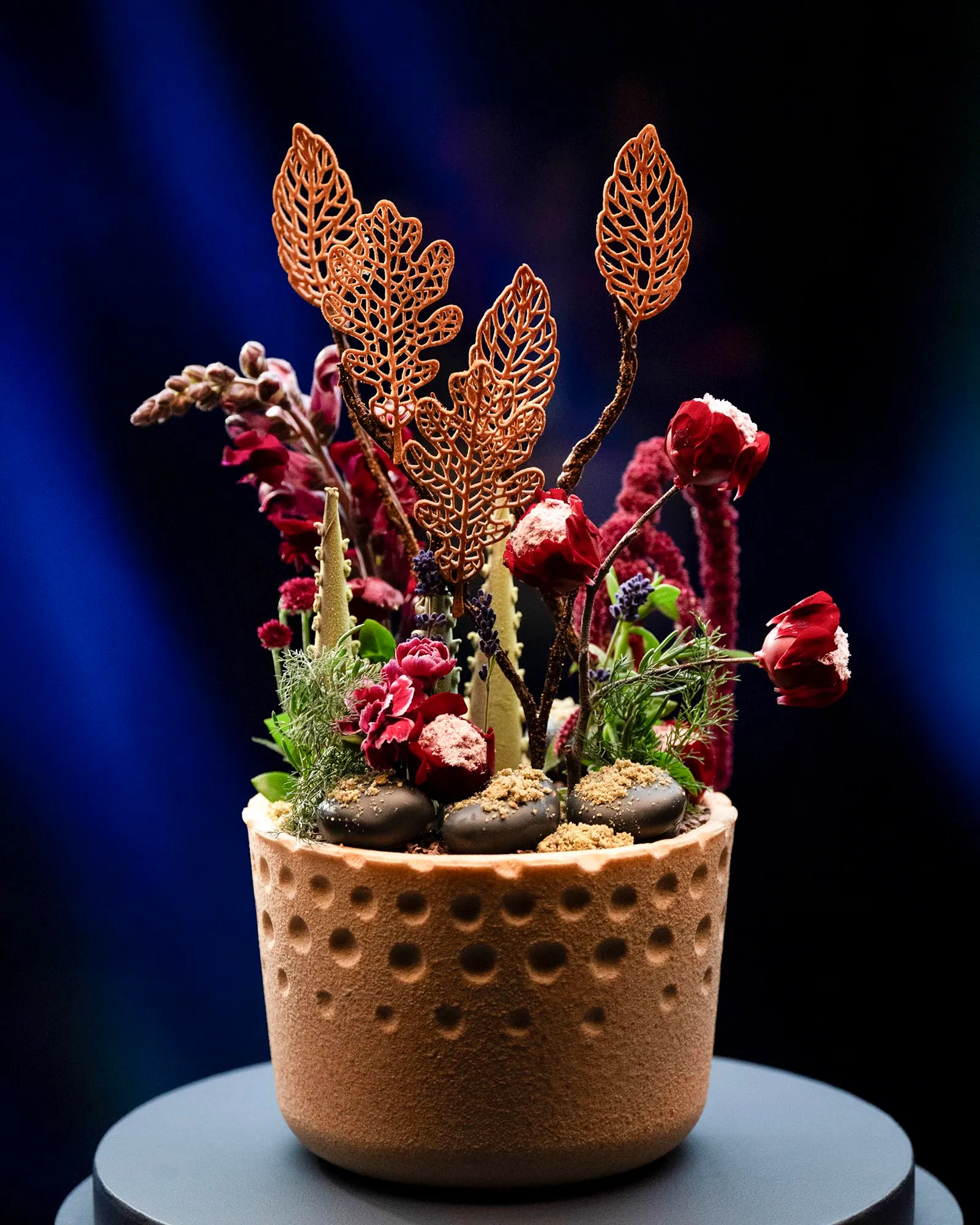 The pitch of Aspiras’ finale show piece is a fully edible potted plant focused on putting native Australian ingredients forward, with a touch of endemic Philippine flavors. Served as a high tea-style petit four dessert, the hand-carved white chocolate pot is filled with cocoa nibs, pebble stone profiteroles, raspberry ganache flowers, aloe gel-filled chocolate leaves, wattleseed tuile leaves with pili nut butter, surrounded by coastal plants and fresh herbs.