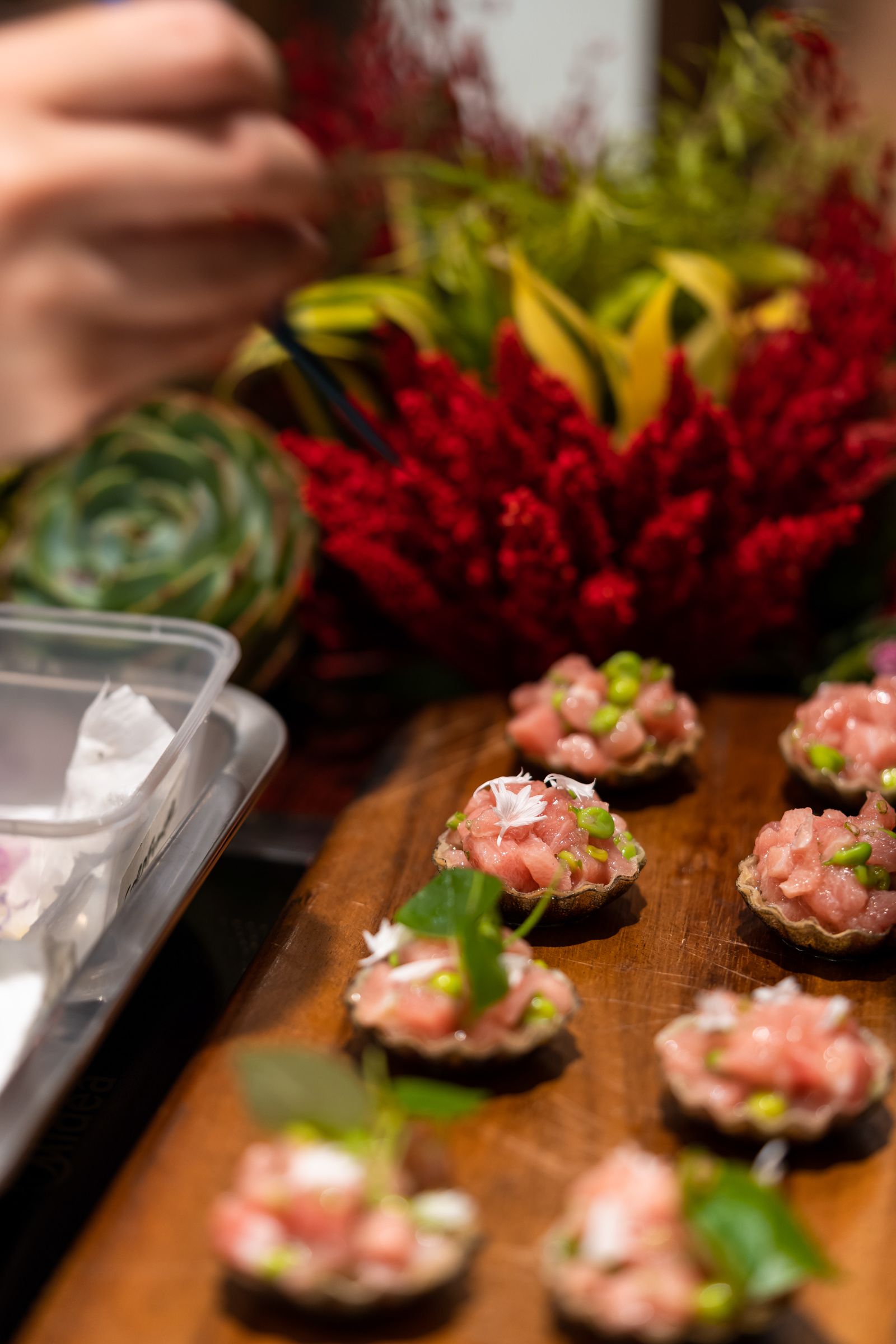 Guests, mingling in the foyer, began with canapes of bite-sized chutoro tartare tarts painted with squid ink and layered with sugar snap peas. “Instead of throwing out the pea shells, we juice them and serve them alongside the tart as a refreshing shot,” Siy says, introducing us to her sustainability-driven approach to cooking that has garnered accolades for Lolla, the restaurant in Singapore where she has been working as head chef since 2020.