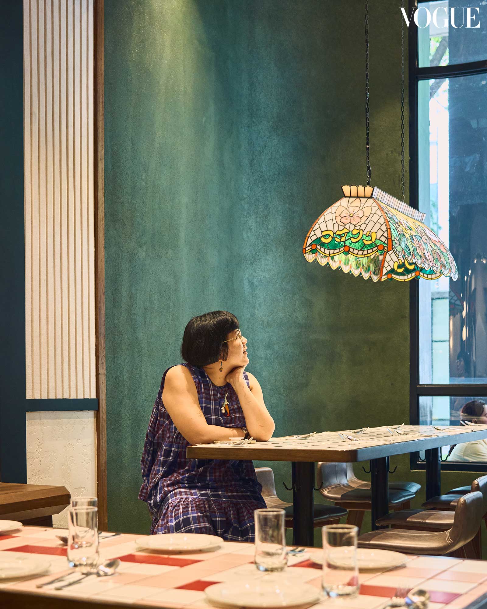 She points to the vaulted ceiling that are built with acoustic panels that absorb sound. It’s a design choice made from their experience in Salcedo, where noise was one of their early problems. “Every little thing that you see here is the product of scrutiny,” she says, gesturing to the custom-made tables with rounded corners, one of her favorite details.