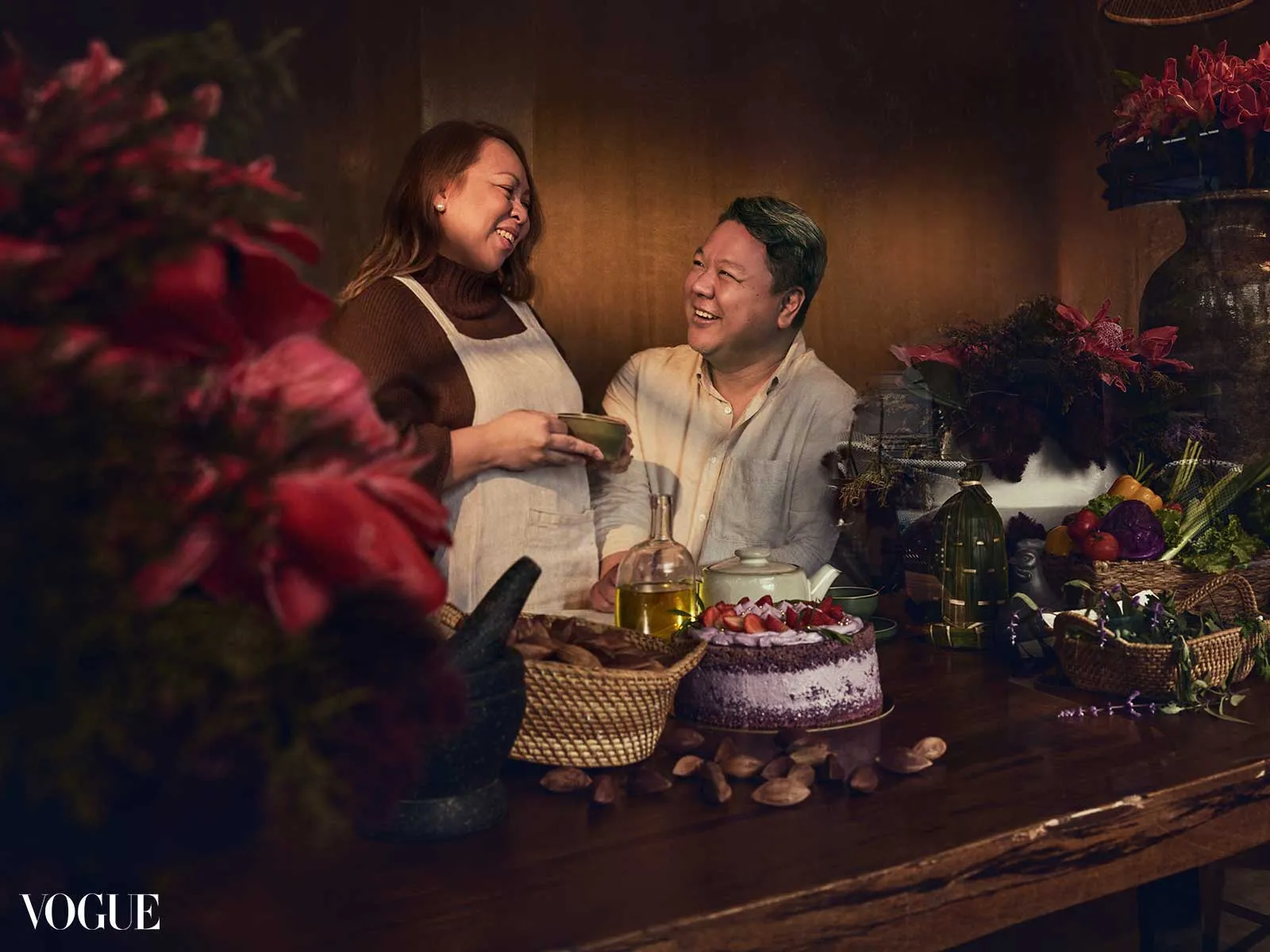 Sunlight spills across the terrace of The Fatted Calf, softening the edges of a room that looks out onto a patchwork of gardens and greenery. At a long table, Chefs Jayjay and Rhea Sycip sit behind a spread of objects pulled from their daily rhythm: pili nuts sourced from the Bicol region, asin buy-o or artisanal sea salt from friends in Zambales, fresh greens harvested from their greenhouse, and a bright purple ube cake made by Rhea herself. Married for 15 years, the ease in their partnership reads clearly: he caresses her hair in between takes, she fixes the collar of his shirt, and they tease each other relentlessly. Asked how they express affection, either through words or actions, they answer: food.