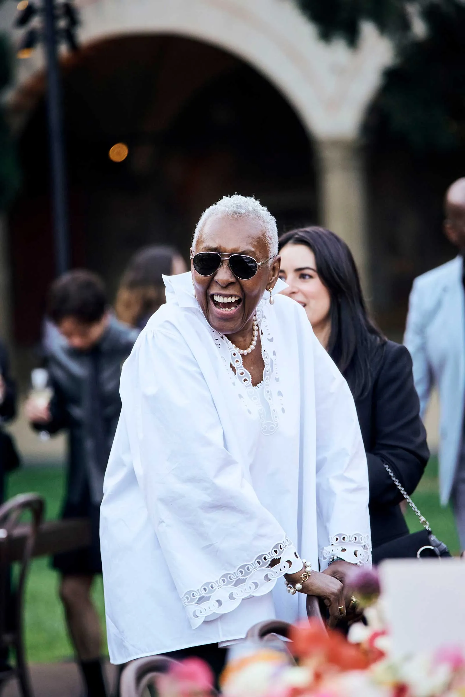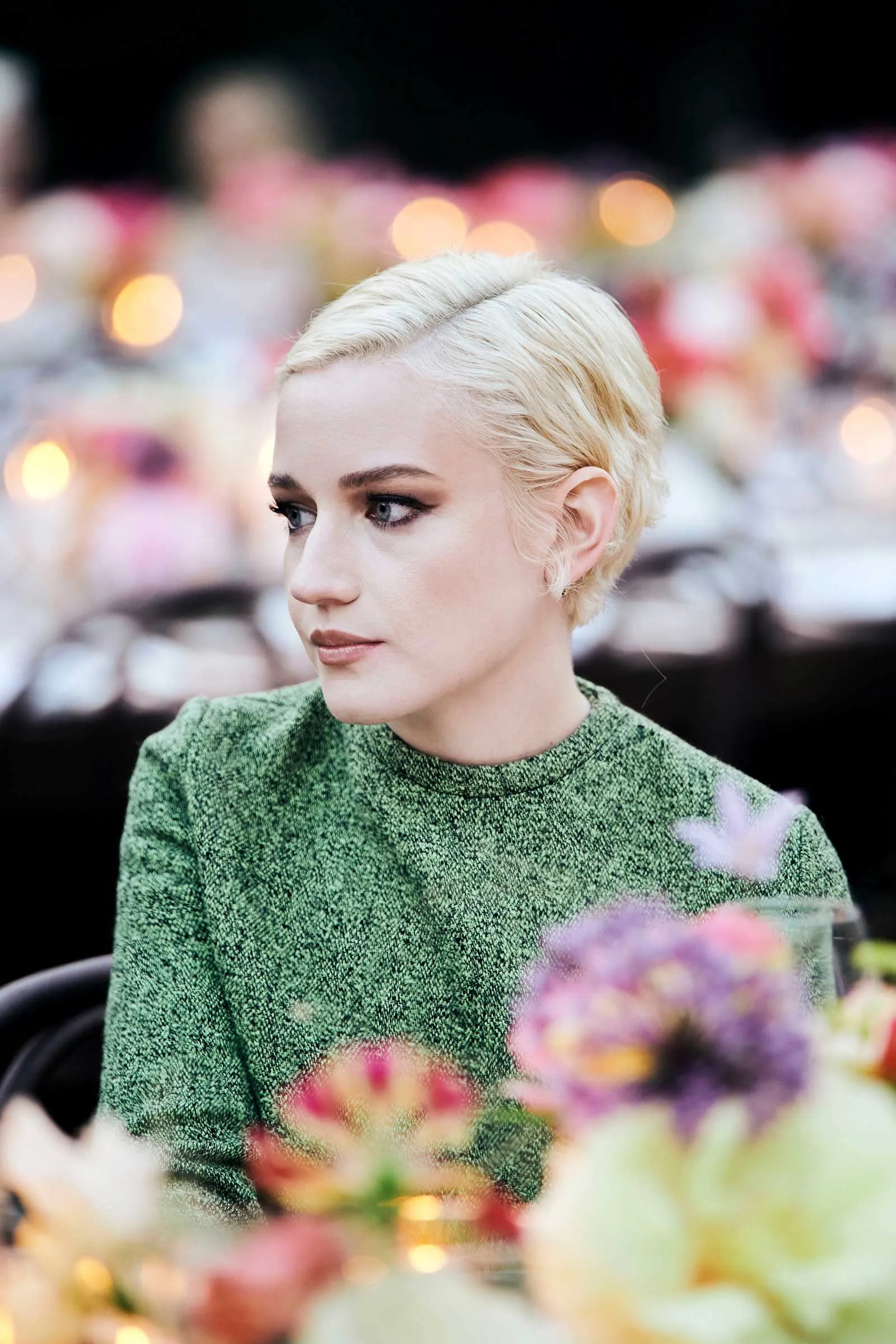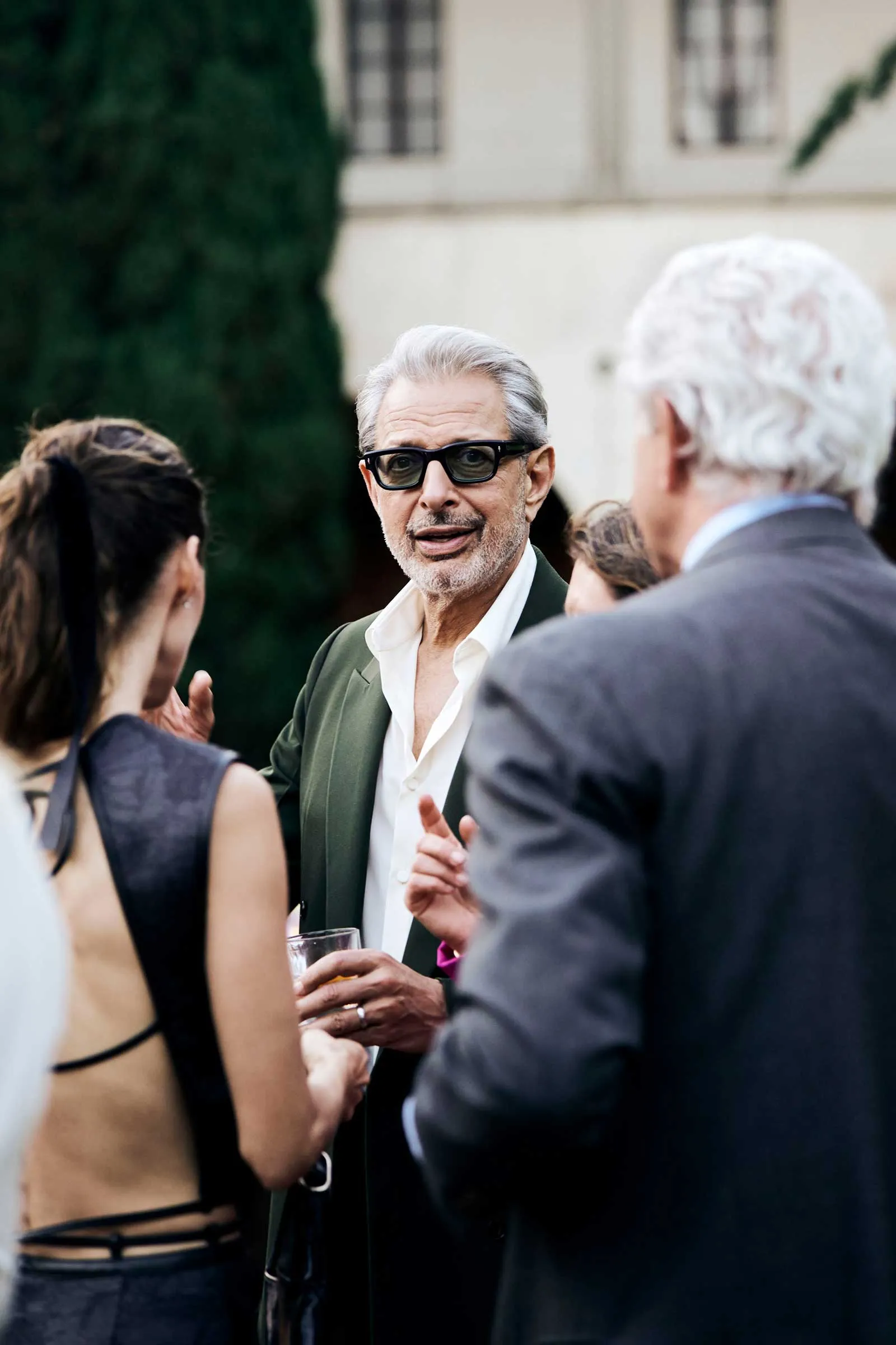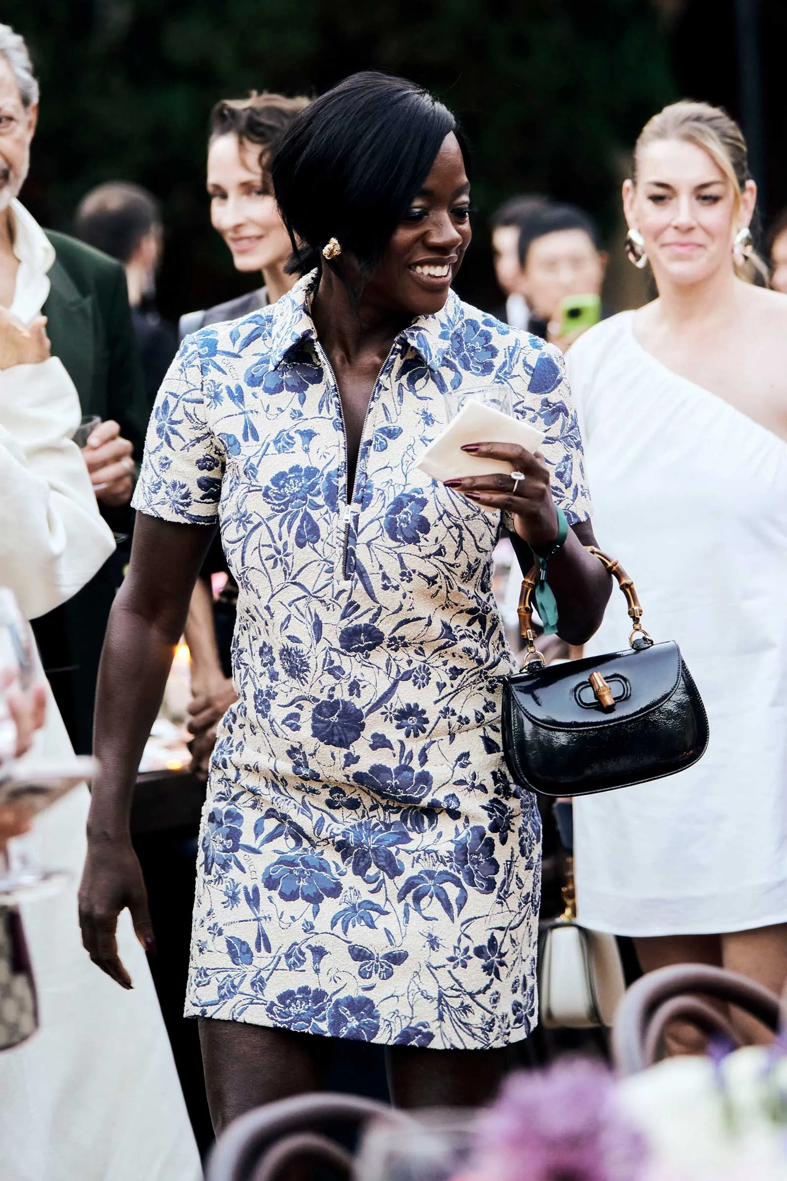 Lit by hundreds of flickering candles and nestled beneath 14th-century frescoes, the long tables looked more like something out of a Botticelli dreamscape than a fashion dinner (see: florals for days). Guests including Julia Garner, Viola Davis, Paul Mescal, and Jeff Goldblum took their seats as servers circulated the first course—a menu designed by Gucci Osteria’s Massimo Bottura, the three-Michelin-starred mastermind behind the brand’s culinary wing. Garner, dressed in mossy green tweed, sat beneath a cloud of garden roses and peonies; Davis, radiant in a blue and cream floral mini, arrived with a bamboo-handled Gucci 1947 bag in tow.