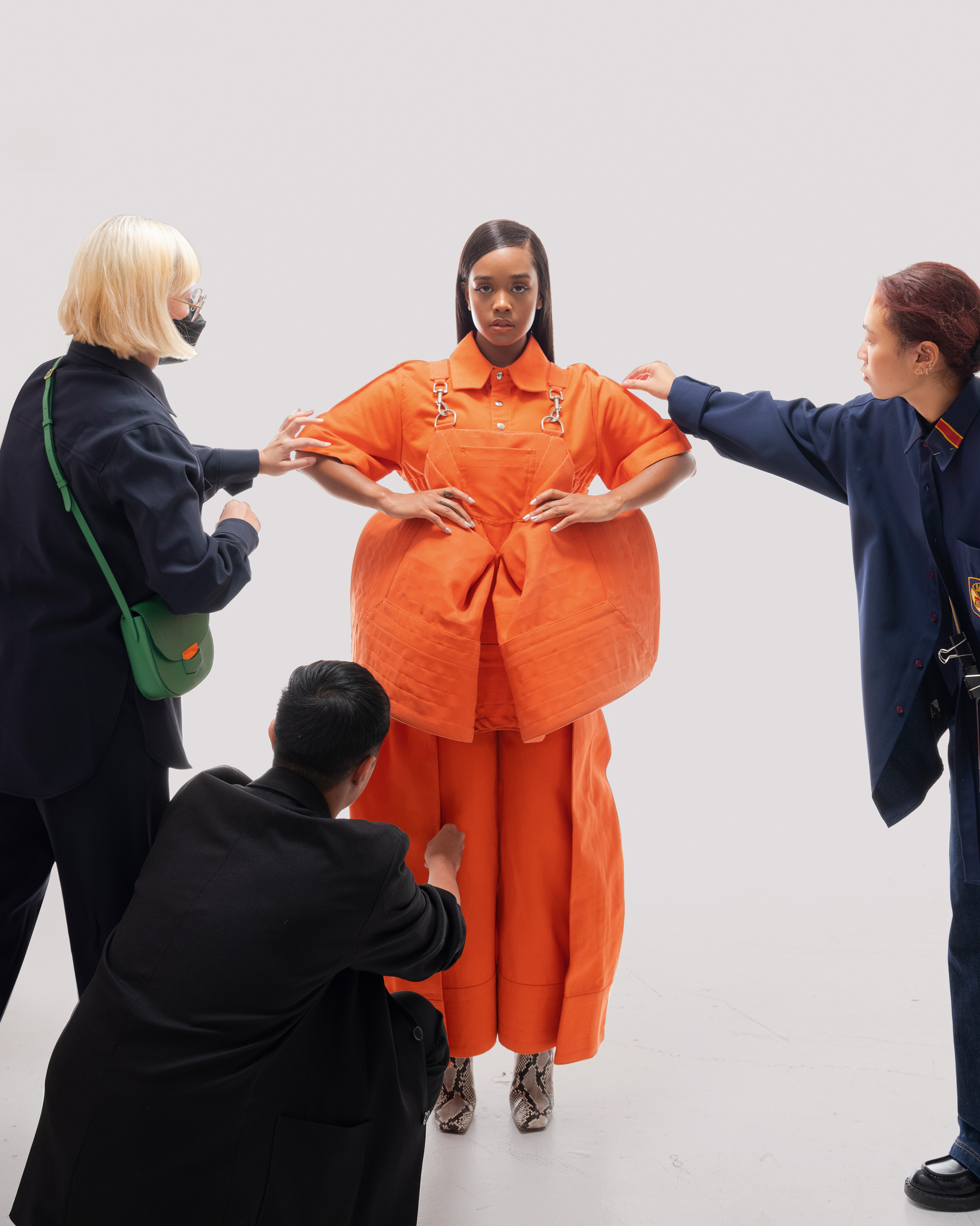 JAGGY GLARINO orange “Paper plane” jumper, button-down, and trousers. Photography by SHAIRA LUNA