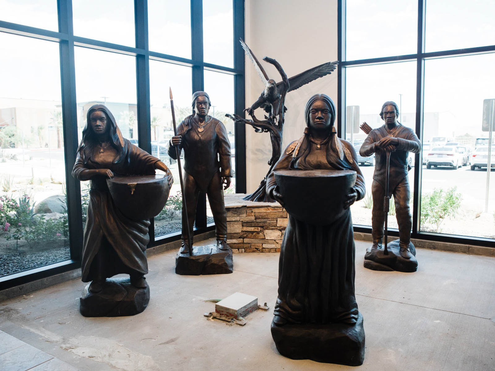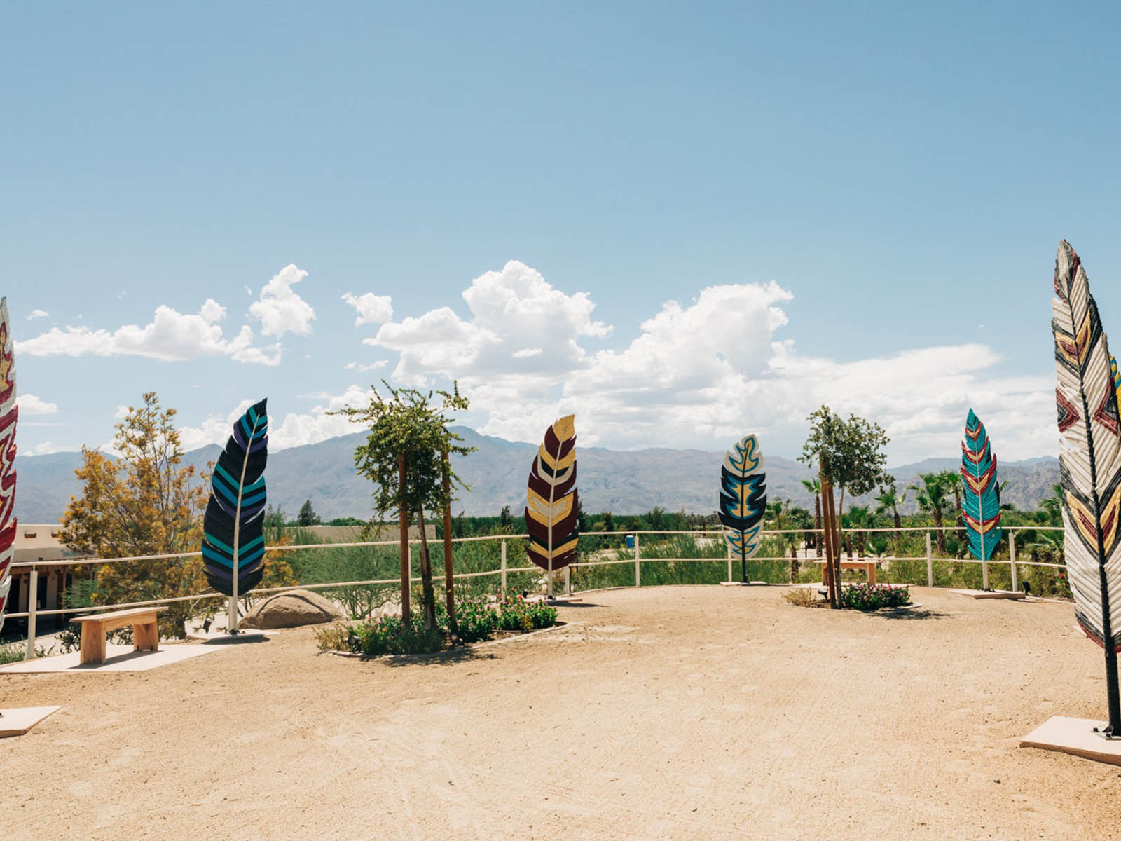 The farm sits right next to Augustine Casino, and the first thing that greets you as you enter is the Seven Features Hill – an elevated circular lookout offering 360-degree views of the farm against the backdrop of the mountains. Seven eight-foot feather sculptures made from recycled tyres by artist Blake McFarland line the lookout, representing seven generations of the past as well as the seven adult tribal members of the present – and honouring the importance of respect and stewardship of the land.