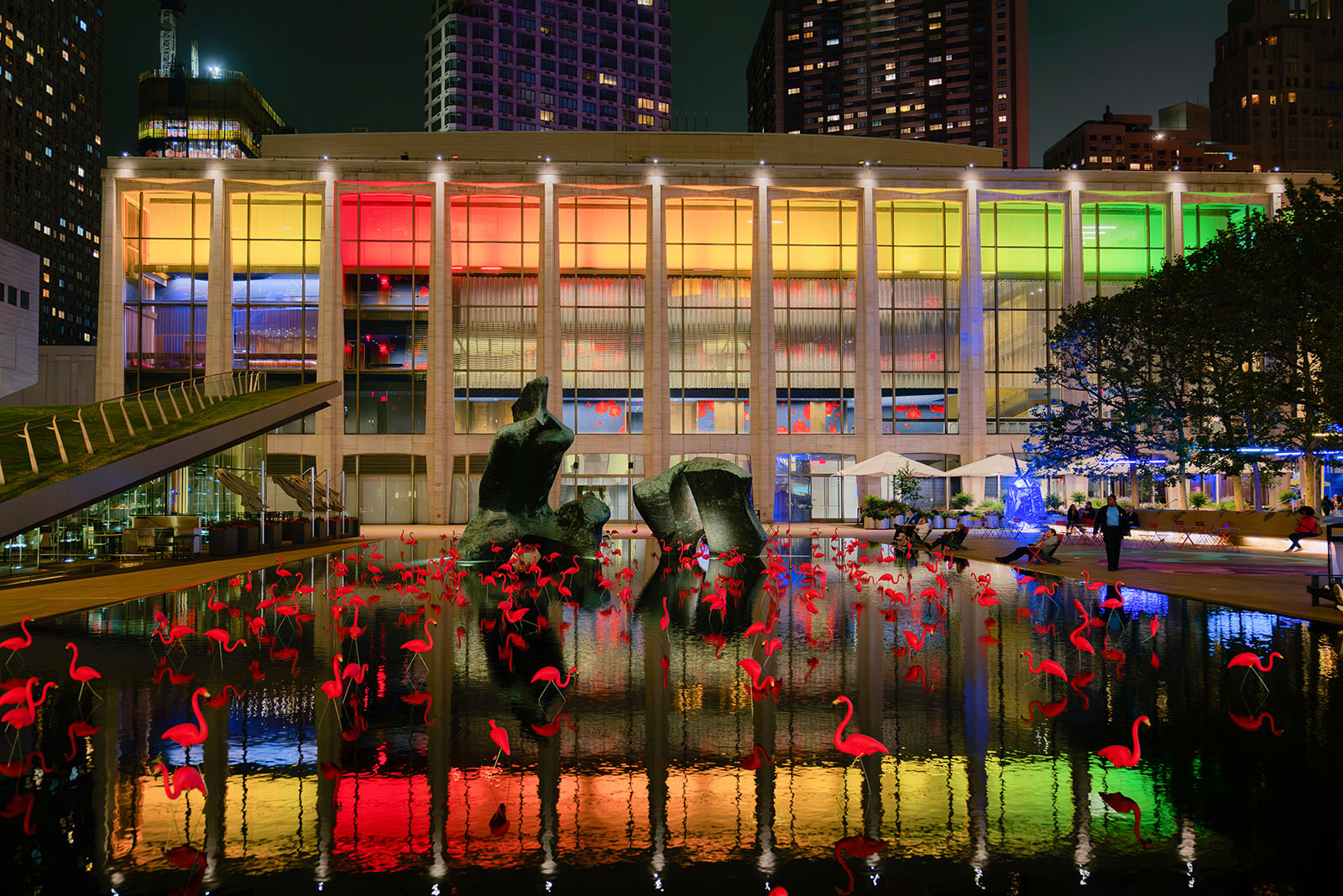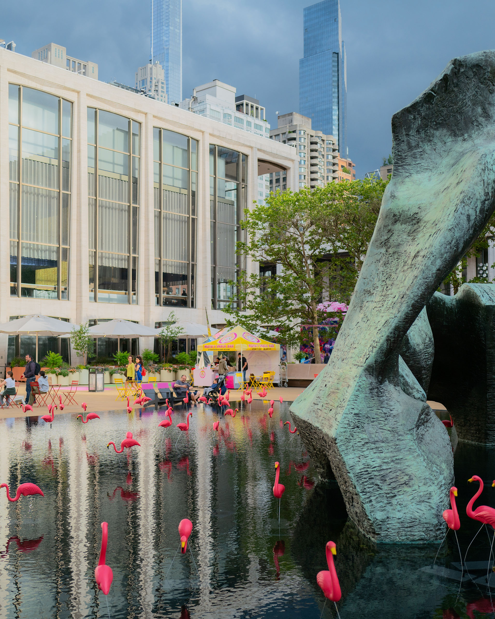 200 installations of hot pink flamingos fill Hearst Plaza. Photo by Lawrence Sumulong, courtesy of Lincoln Center.