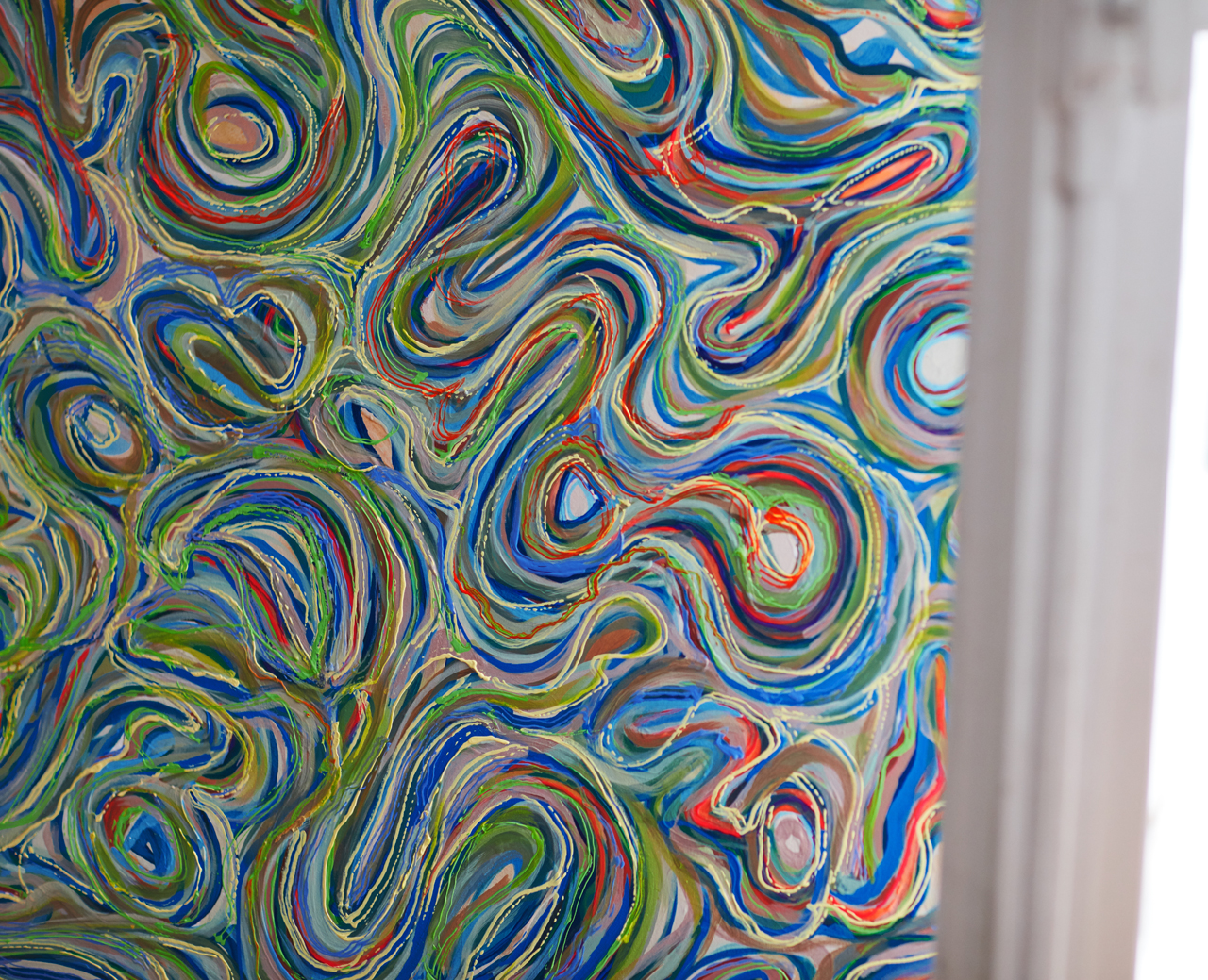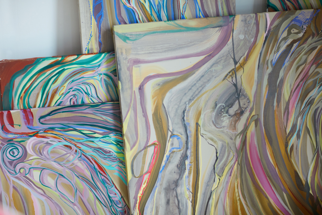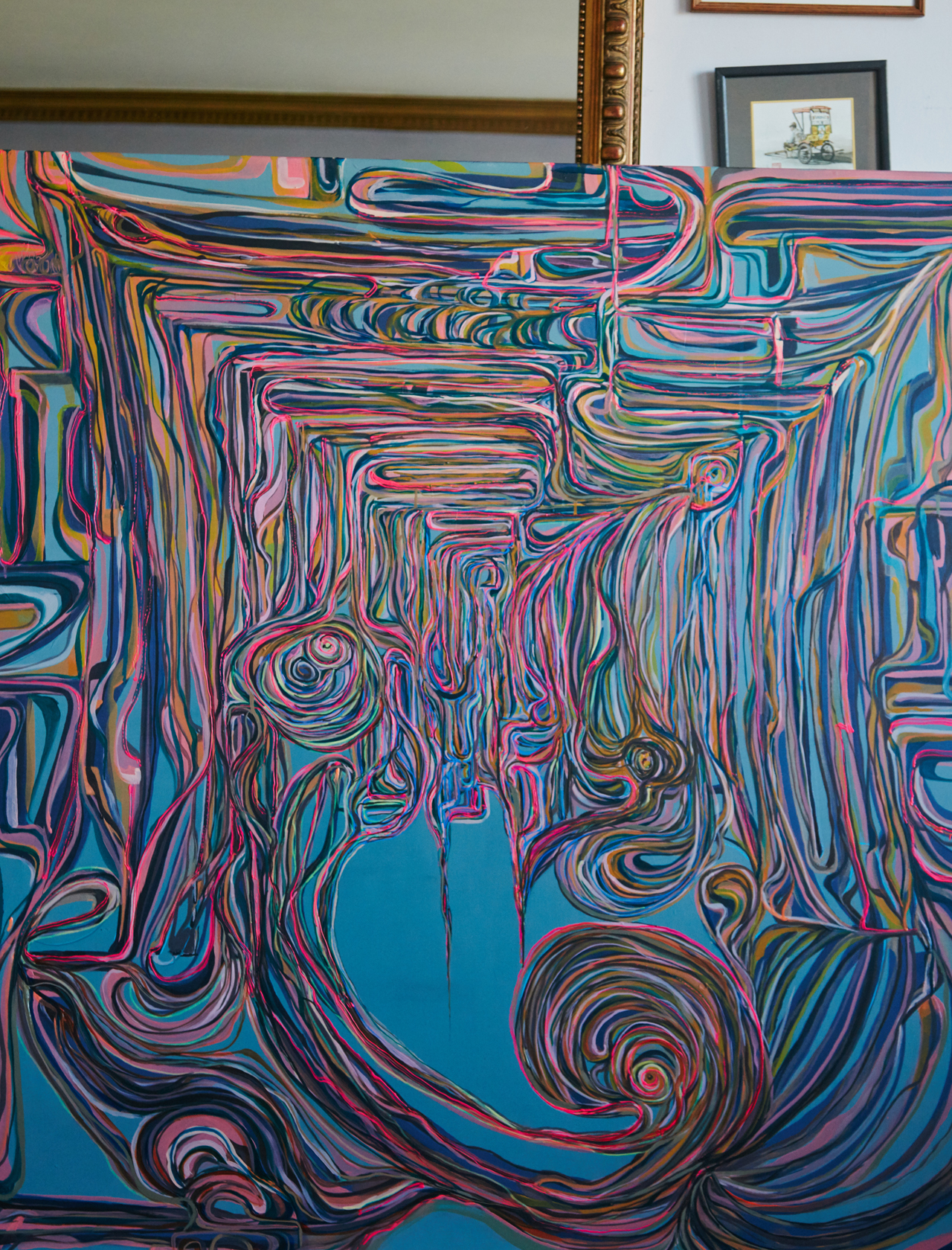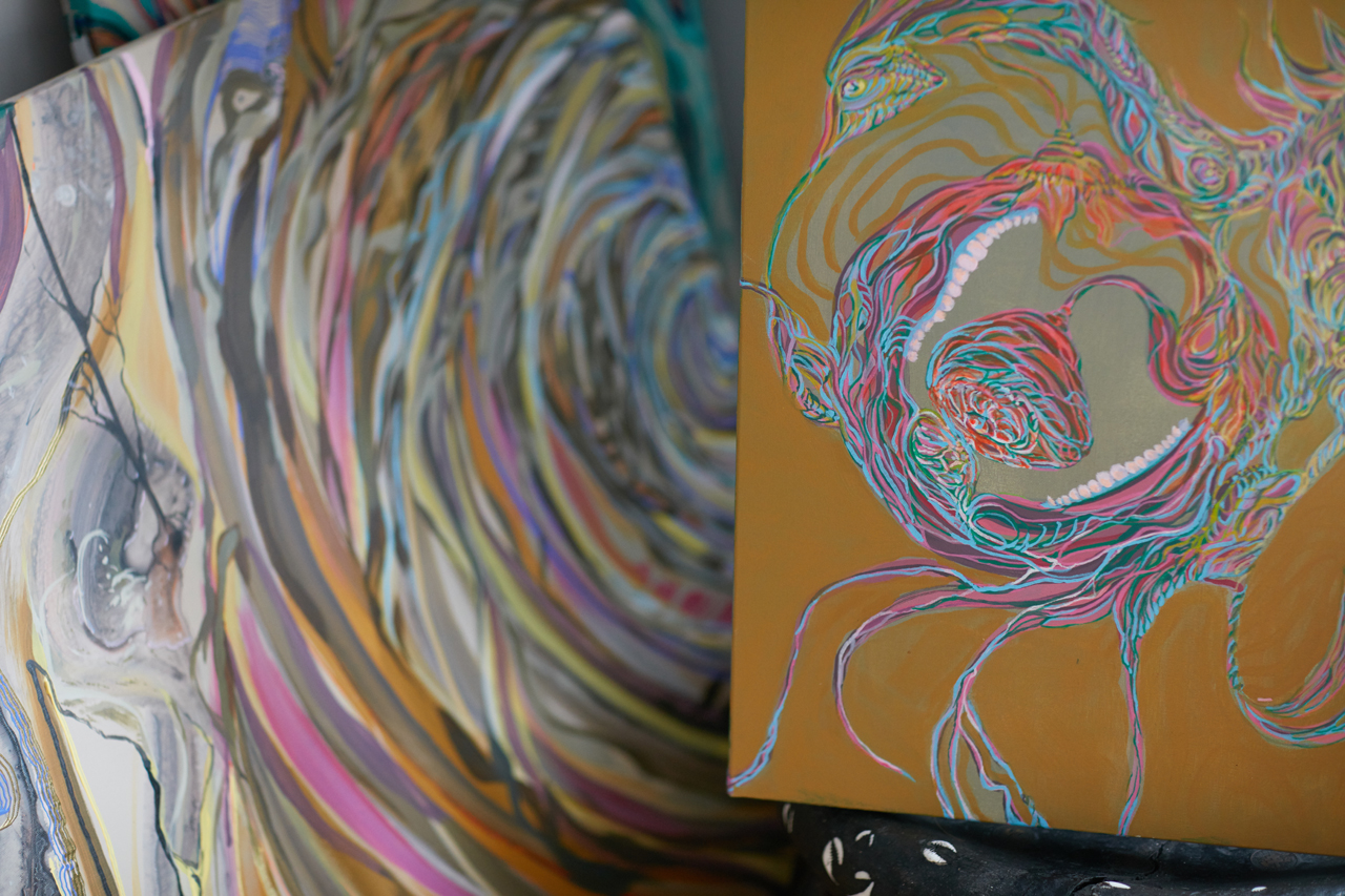 Like many artists, Nicdao puts acrylic to canvas to express emotions that are hard to verbalize, though he does it in a way unique to him and his own experiences. His artistic process involved blasting music—anything from techno to Mozart—while he would sketch and paint. During breaks, he would socialize, peruse old books for inspiration, and browse color wheels. The visceral process often required a literal breath of fresh air. Nicdao’s favorite method of doing so is to take a walk outdoors.