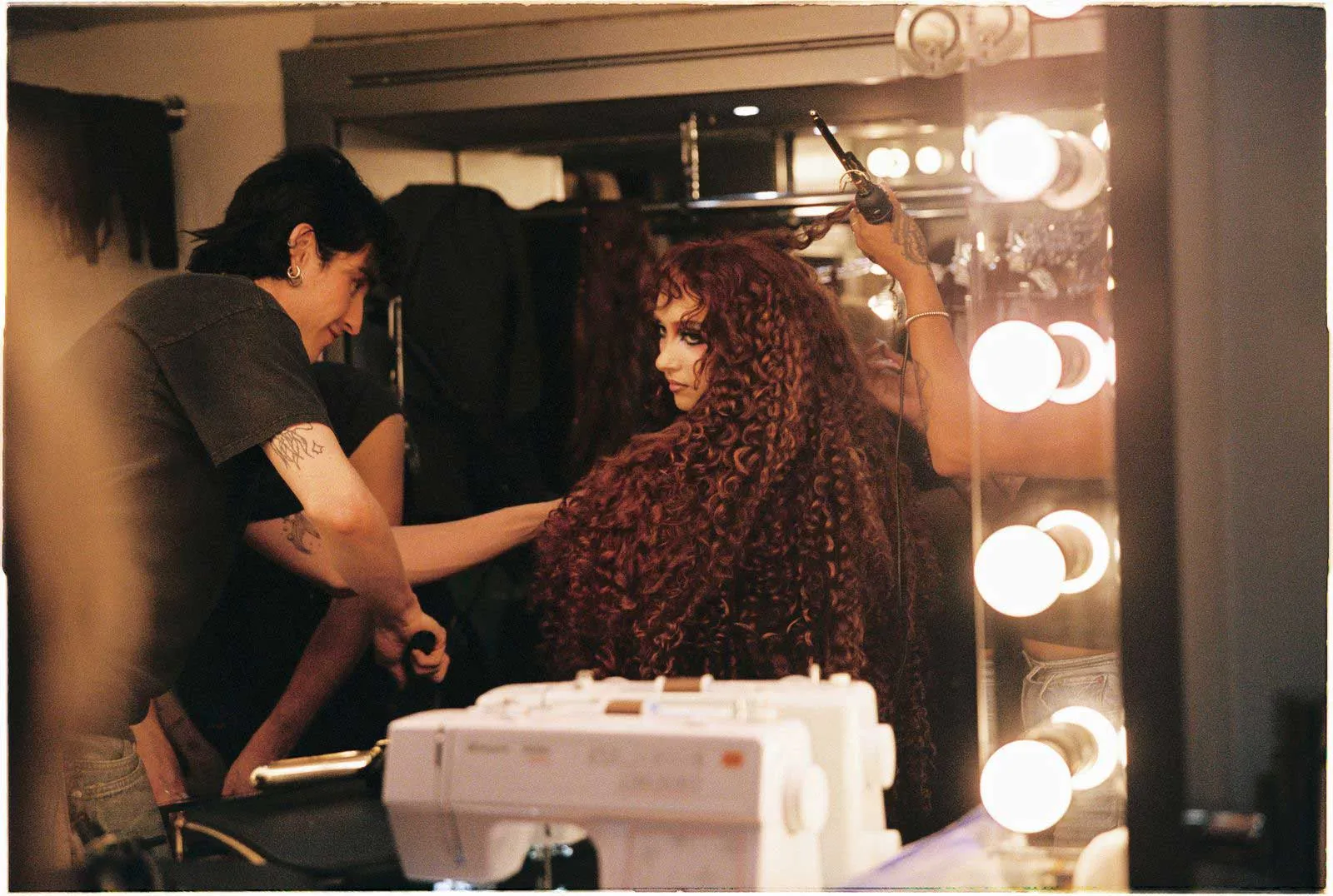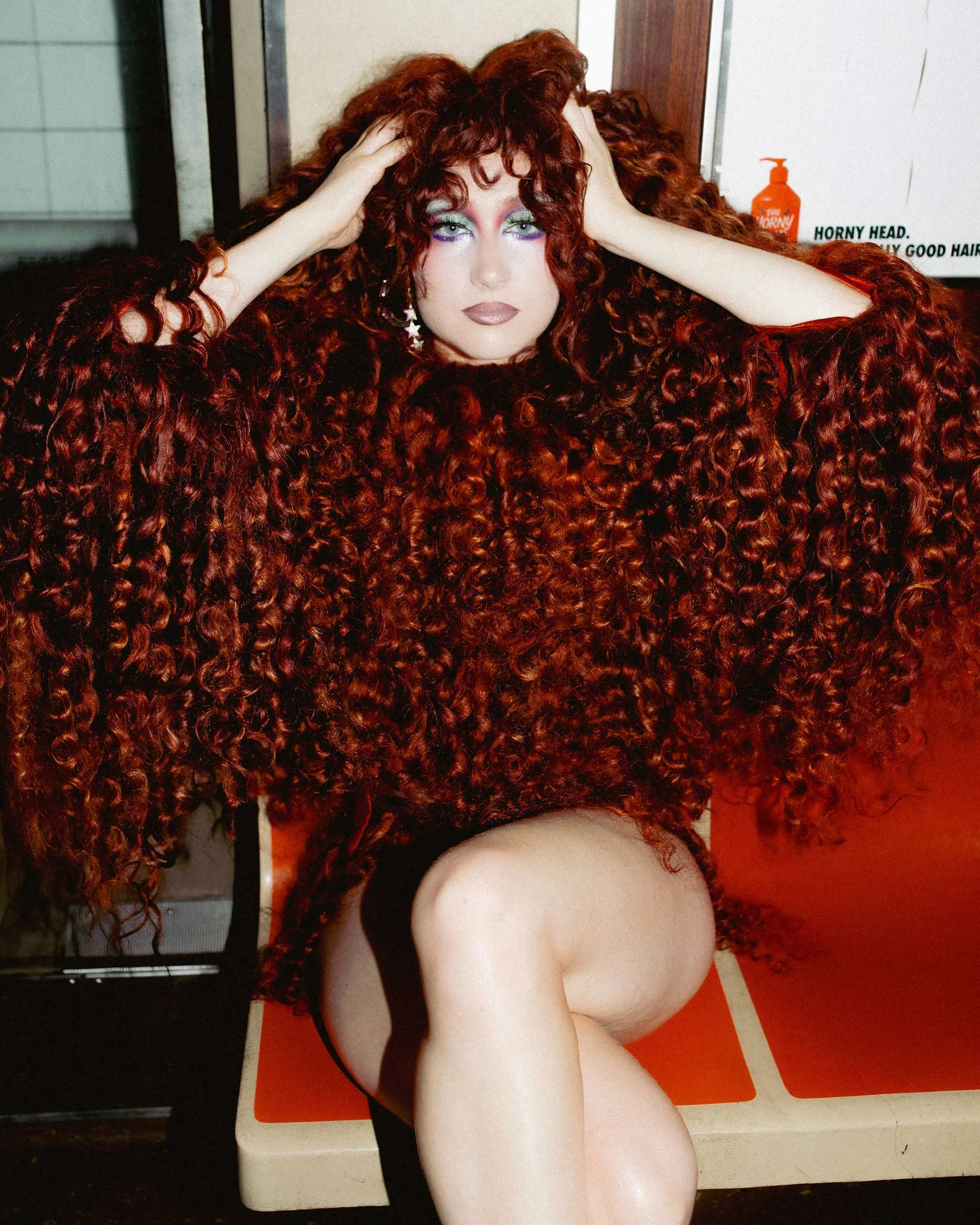 “The Subway” was a different story: Roan dreamed up a campy, New York romp that follows the star, all but swallowed up by her red mane, as she pursues the green-haired, Cousin It–esque creature who broke her heart. (On set, I watch Roan—styled by Genesis Webb in a human hair two-piece by Todd Thomas and John Novotny—dance her way through a bustling, clubby train car in pursuit of the anthropomorphic green wig.) “I didn’t want it to be super serious,” she says. “It is a serious song, but at the same time it’s not, because I say, ‘Fuck this city, I’m moving to Saskatchewan.’ It’s not that serious.”