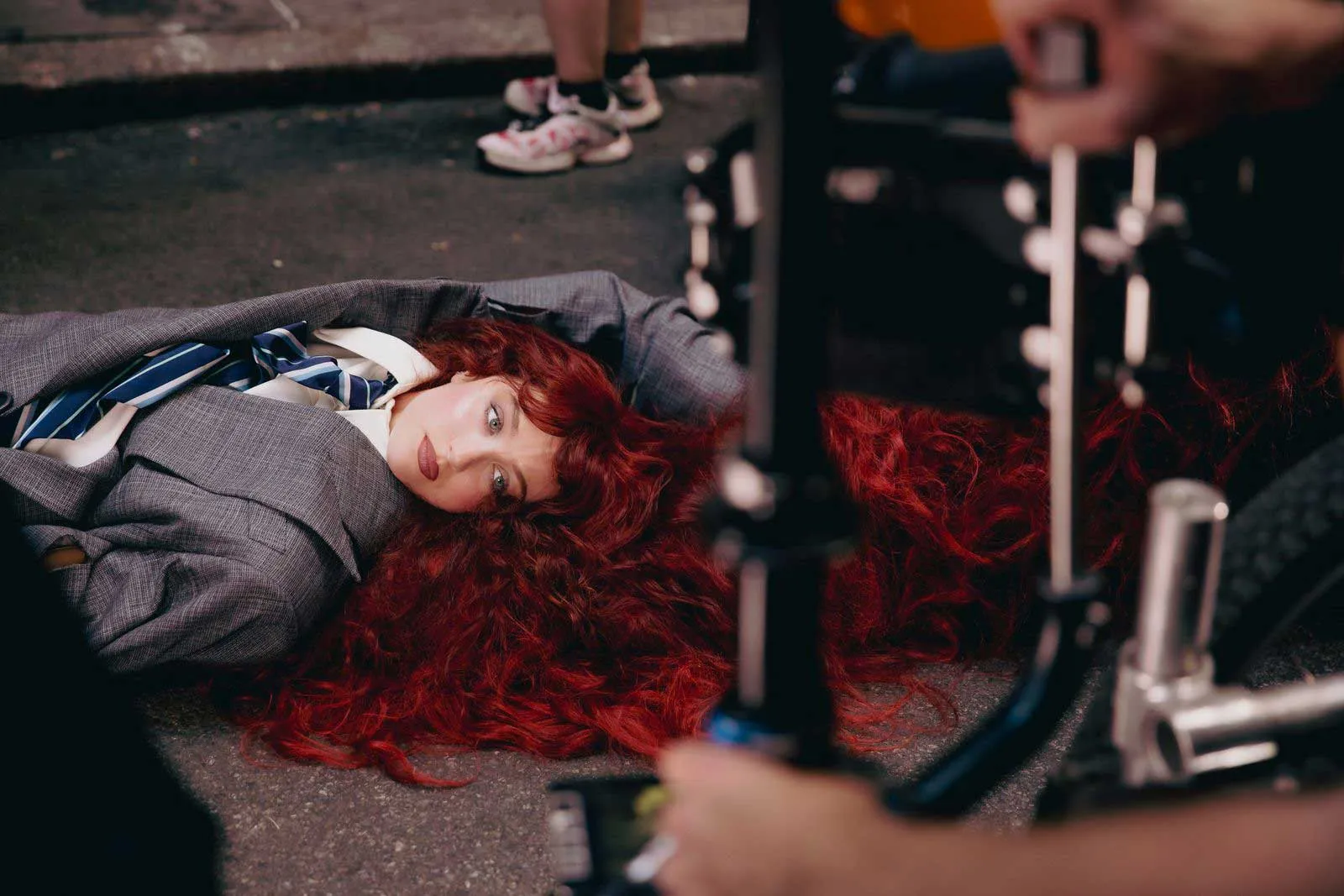 The day after we met at the museum, fans spotted Roan filming in Manhattan, her locks cascading down a fire escape like Rapunzel’s, dressed in a Connor O’Grady cone bra and skirt made of matching human hair. It took almost no time at all for sleuths to match grainy videos of her lip-synching to the song’s lyrics. The TikToks proliferated within hours, and photos of Roan shooting another scene, in which she is dragged hair-first by a taxi, dressed in an oversized suit by AC Gottleib and James Nguyen, spread like wildfire online. (Even when it’s not used as an extravagant prop, Roan finds that her hair draws attention: “I can’t hide if my hair is out,” she says. “I just cover it and wear a wig. I got pretty frustrated with my hair and got really close to cutting it all off or dyeing it really dark so it just didn’t scream red hair, but it’s always been a part of my brand.”)