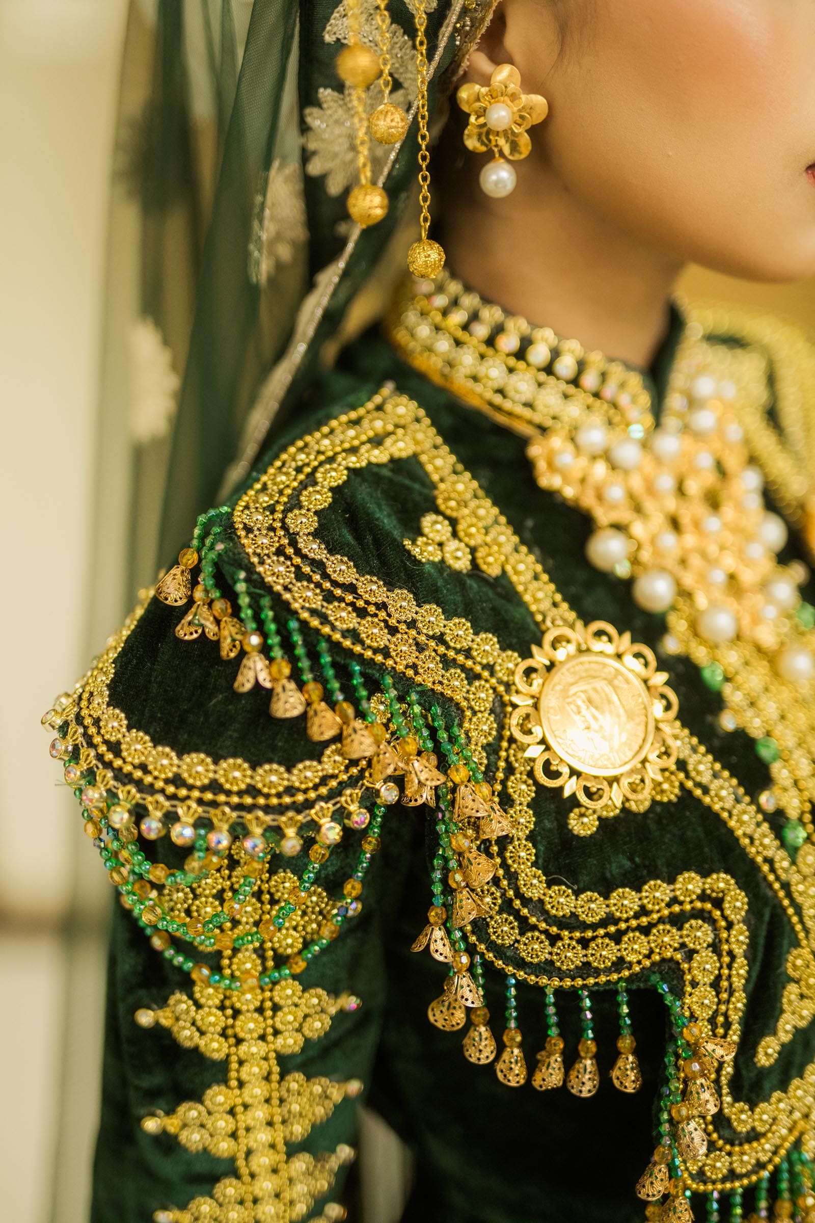 The veil, handmade in India, had rested in my mother’s collection for years, waiting for its moment, now perfectly complementing my Batawi. And on my head, a gold-plated crown from Malaysia, crafted by women whose ancestors, like mine, had endured the weight of colonial rule.