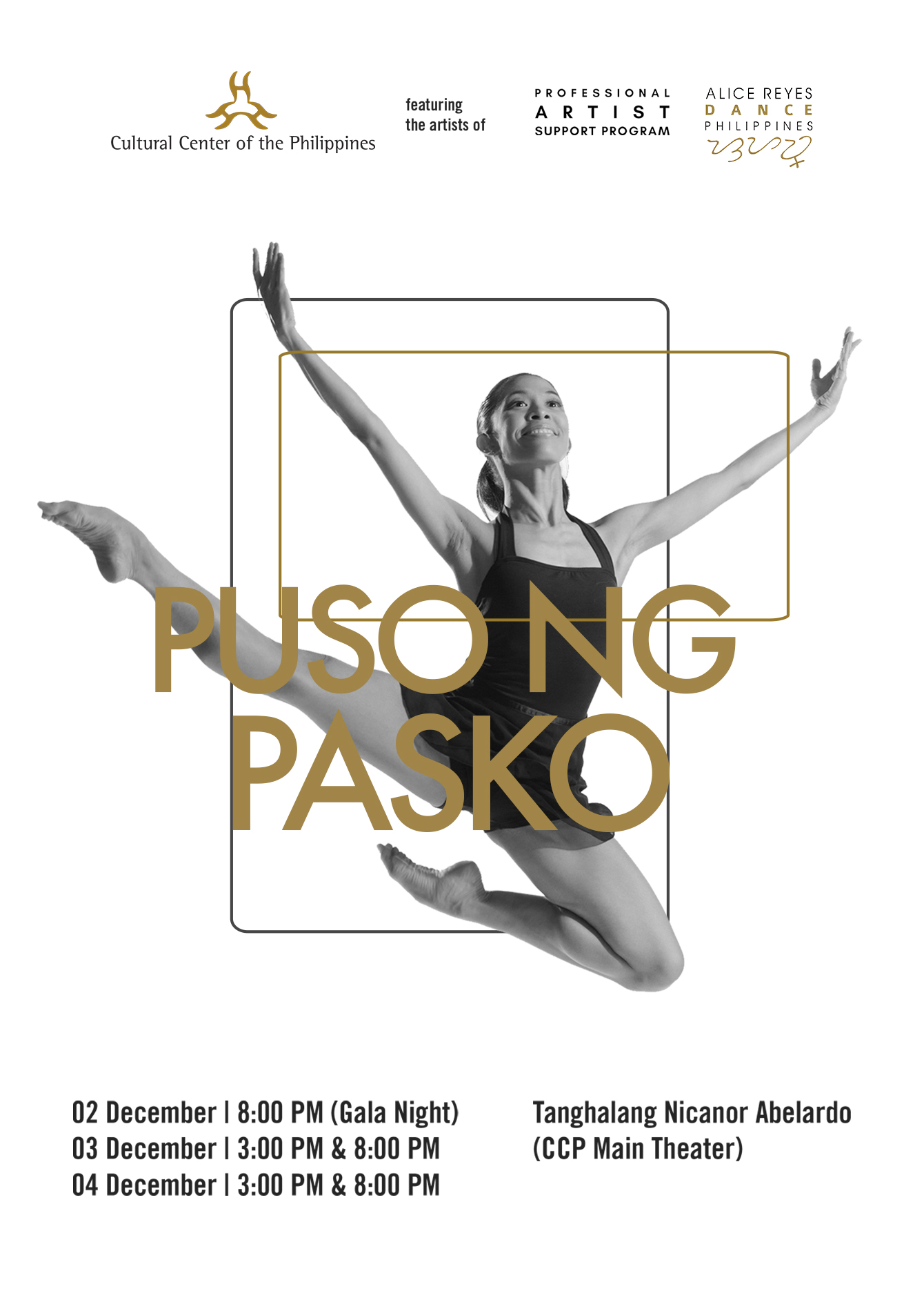Puso ng Pasko, featuring artists of CCP’s Professional Artist Support Program and Alice Reyes Dance Philippines, runs from December 2 to 4 at the CCP Main Theater. Tickets are available here or through the ARDP Ticketing Officer via 09154122152.