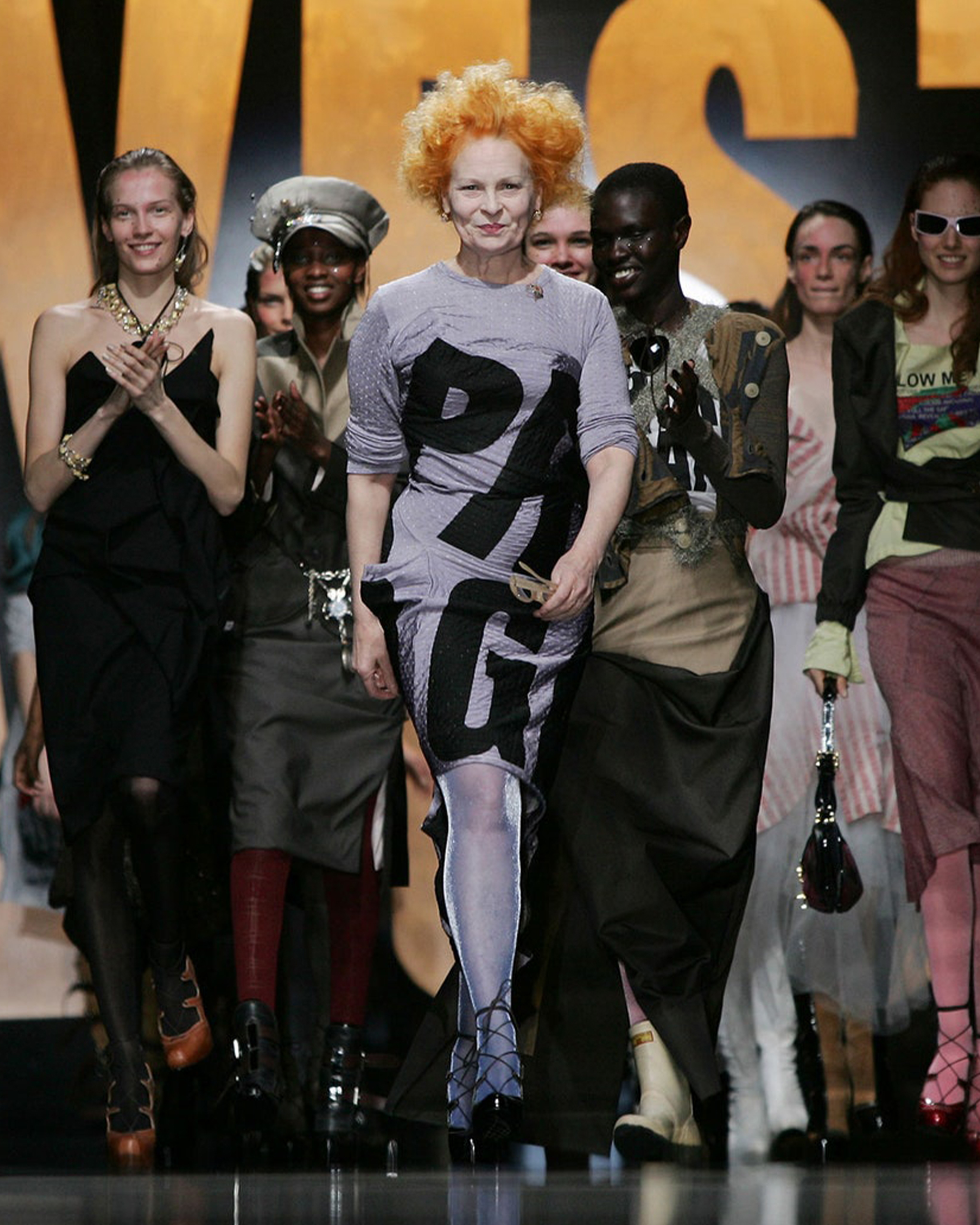 Westwood’s runway has long been her political platform. T-shirts in her spring 2006 collection read “I Am Not A Terrorist, Please Don’t Arrest Me,” while models in her fall 2008 show carried signs demanding fair legal trials for Guantánamo Bay prisoners. A banner in the spring 2013 show called for a climate revolution. Other times she has shown support for U.S. whistleblower Chelsea Manning and WikiLeaks founder Julian Assange, as well as political parties, environmental charities including Cool Earth and Greenpeace, and the Occupy demonstrations in 2011.