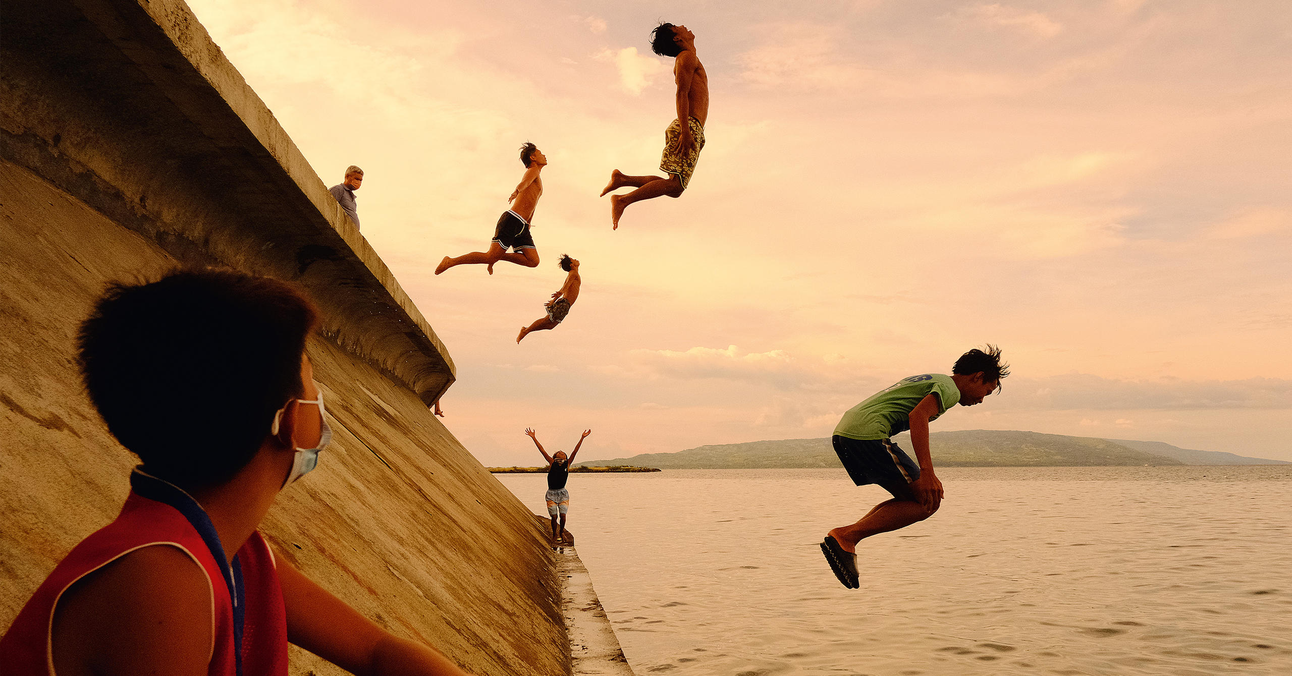 A group of kids take a running leap off the sea wall and into the cool waters of Bantayan Beach. A young boy and an older man observe, while another boy stretches his arms up beneath his flying friends. Photographed by Hersley-Ven Casero.