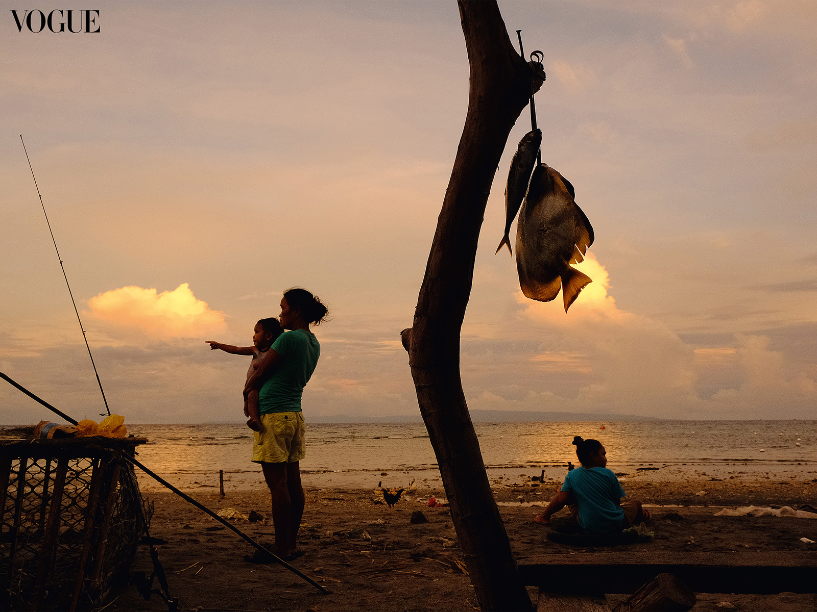 Hersley’s camera captures the dynamic, layered moments that materialize by the shore. Among the photos in “Islanders” is that of a mother carrying her child who points at the distance, their silhouettes eclipsed by the sunset, and some fish hung on a tree. “This photograph was taken in July 2021, along Looc Beach, which is a location I frequently visit […] a fisherman had hung his catch of the day on a wooden post. I positioned myself so that a frame would be created between the fish on the post, and the fishing rods and fish cages. I waited there patiently and hoped that a subject might pass through and make an interesting gesture. The rest was up to the universe to deliver.”
