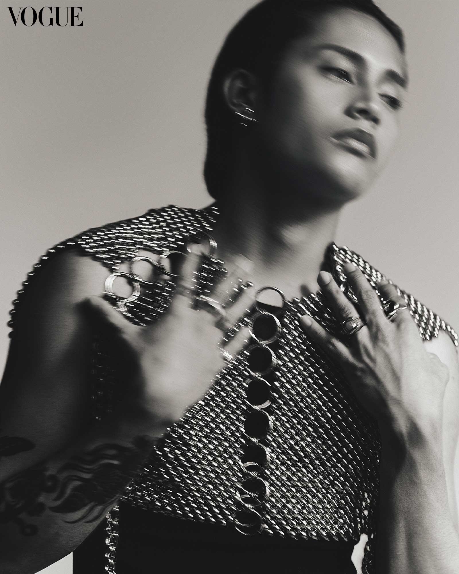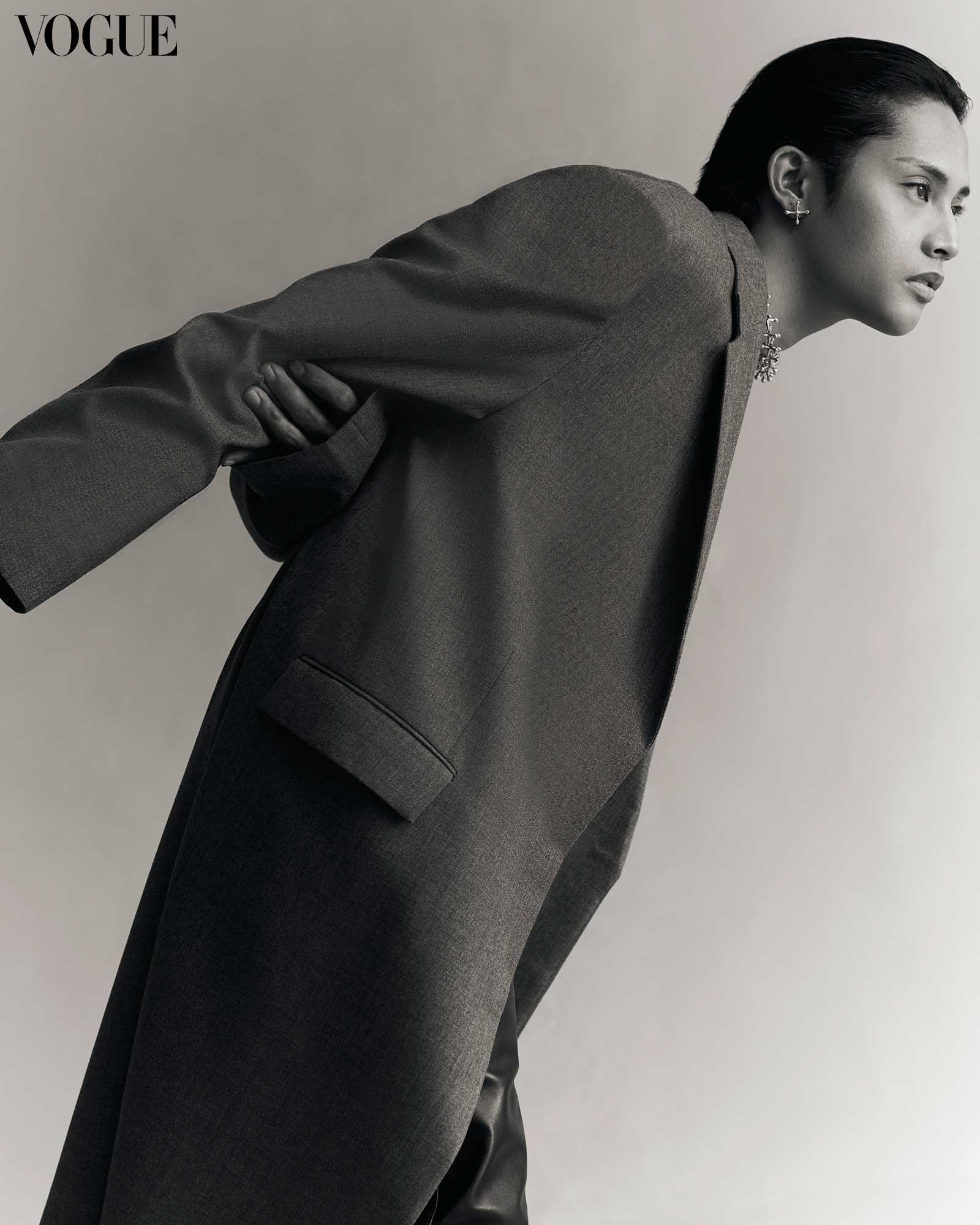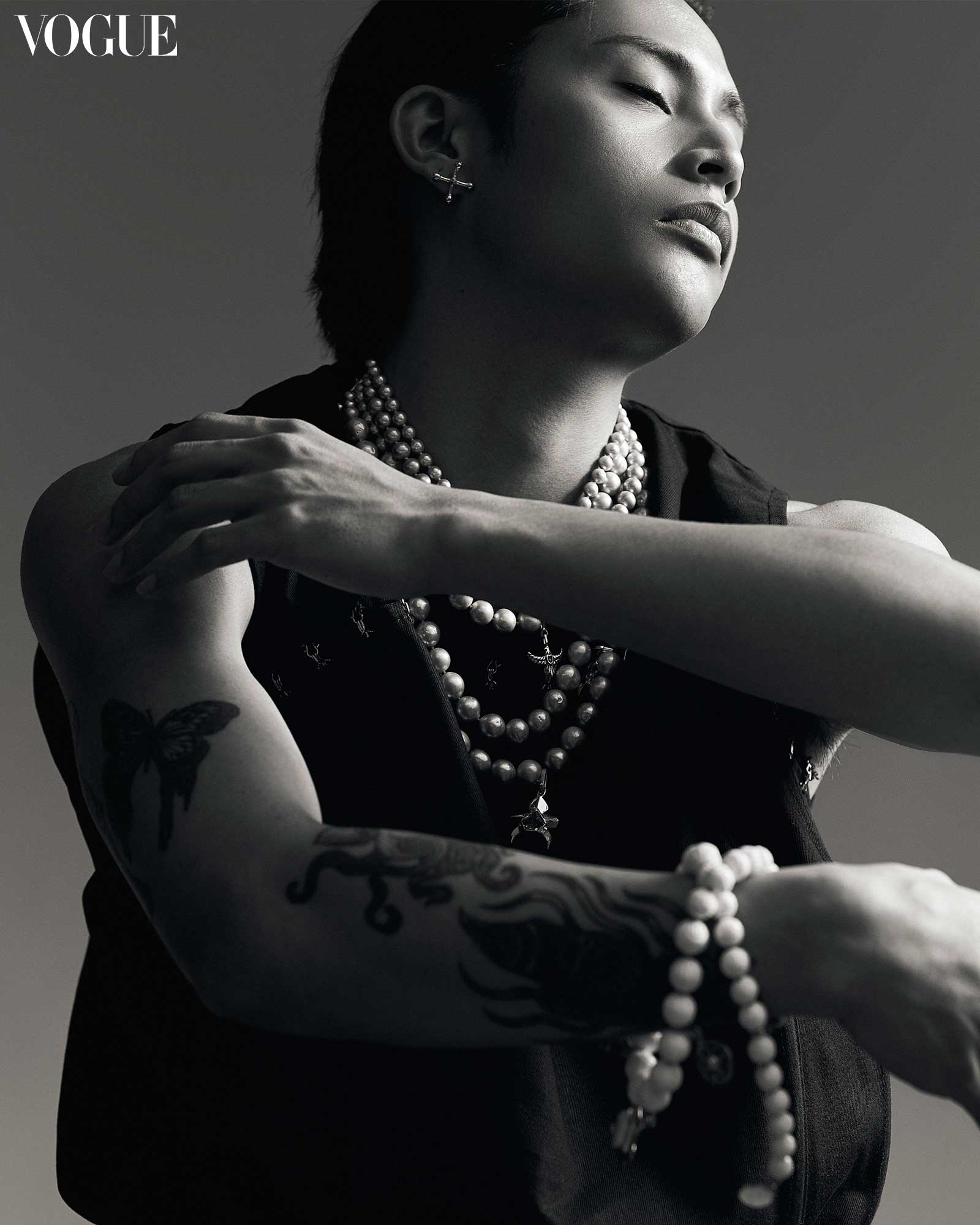NEIL FELIPP x KELVIN MORALES earrings, J MÄKITALO pearl necklaces and Conch Shell necklace worn as a bracelet, ANTONINA top, RANDOLF trousers, and BALENCIAGA boots. Photographed by Renzo Navarro for the May 2024 Issue of Vogue Philippines.