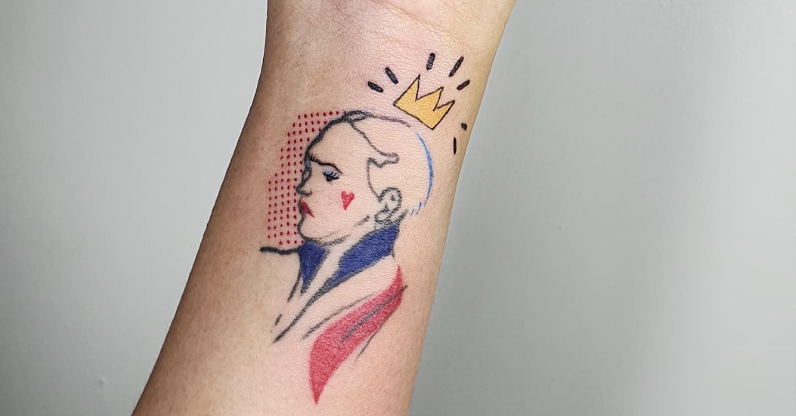 Most Interesting Tattoo Given: One of the most interesting tattoos I’ve done is actually a tattoo enhancement: The client asked me to add to an existing tattoo she had of a man (the great Gatsby)’s head, but she wanted to put him in drag. We pulled inspiration from Sasha Velour, Basquiat, Keith Harring and Roy Lichtenstein. It was a lot of fun to do.