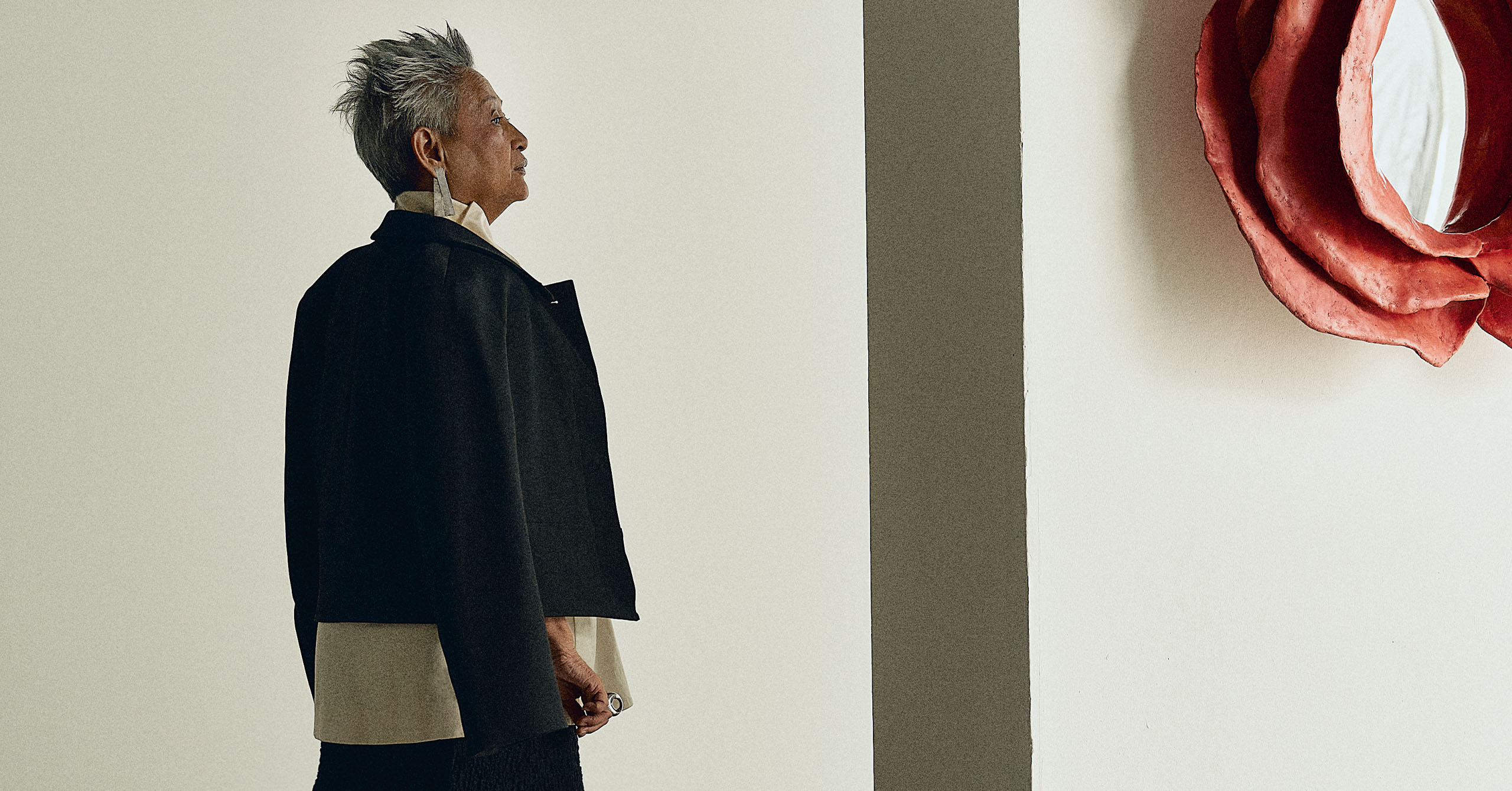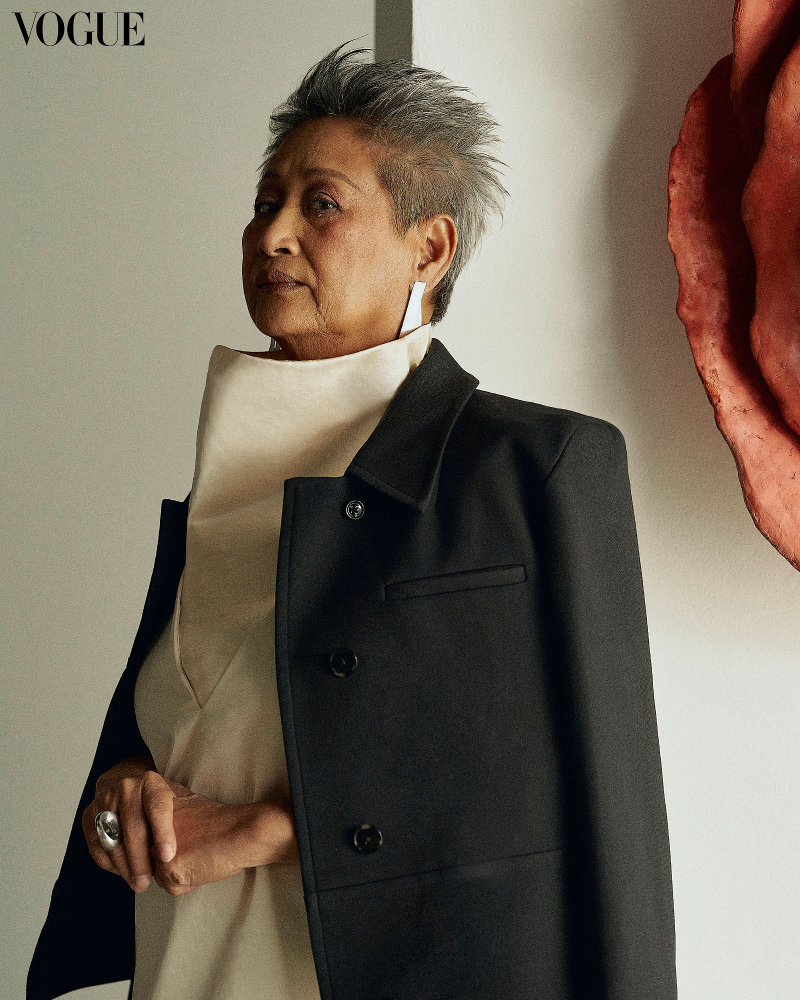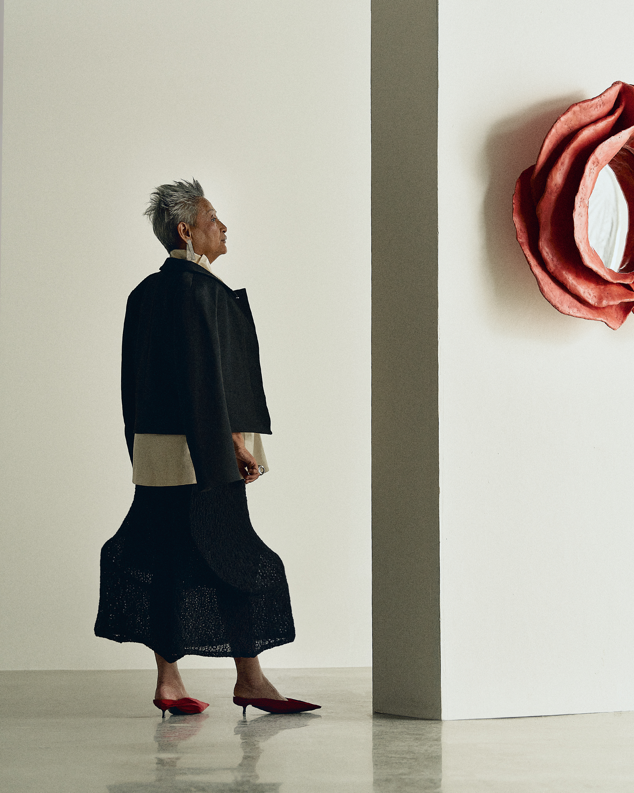 Marian wears JIL SANDER top, MELITTA BAUMEISTER skirt, COMME DE GARÇONS jacket, BALENCIAGA mules, RAMON VILLEGAS