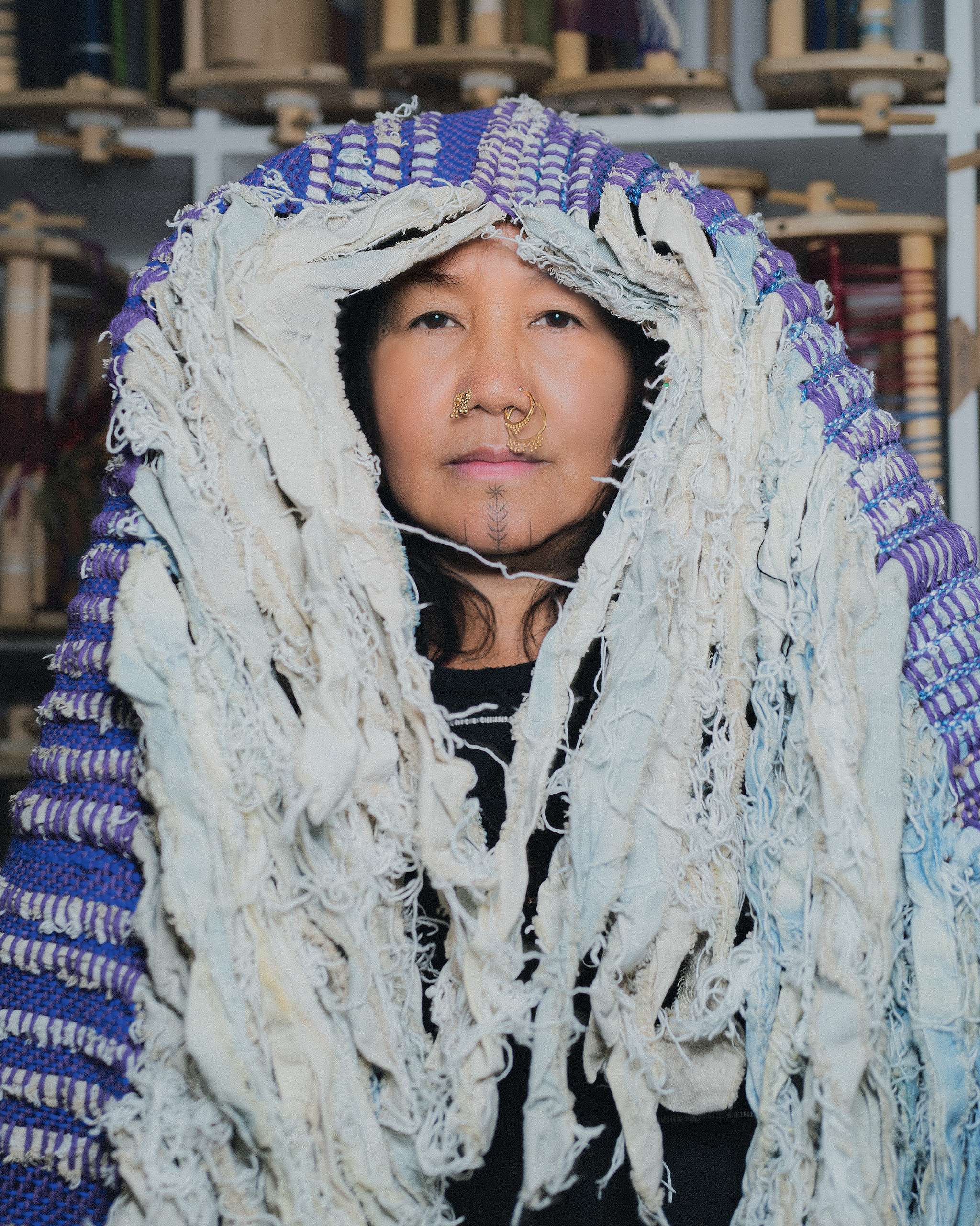 Without the llama mask, her untamed hair tumbles over her shoulders and arms, one inked with bold tattoos. She wears a 21-carat gold nose ring from Nepal—she has five of them, she says—that mark milestones in her life, her divorce, for one; the death of her mother, for another. Ink also adorns her chin and temples, motifs from textiles from her mother’s home province of Nueva Ecija.