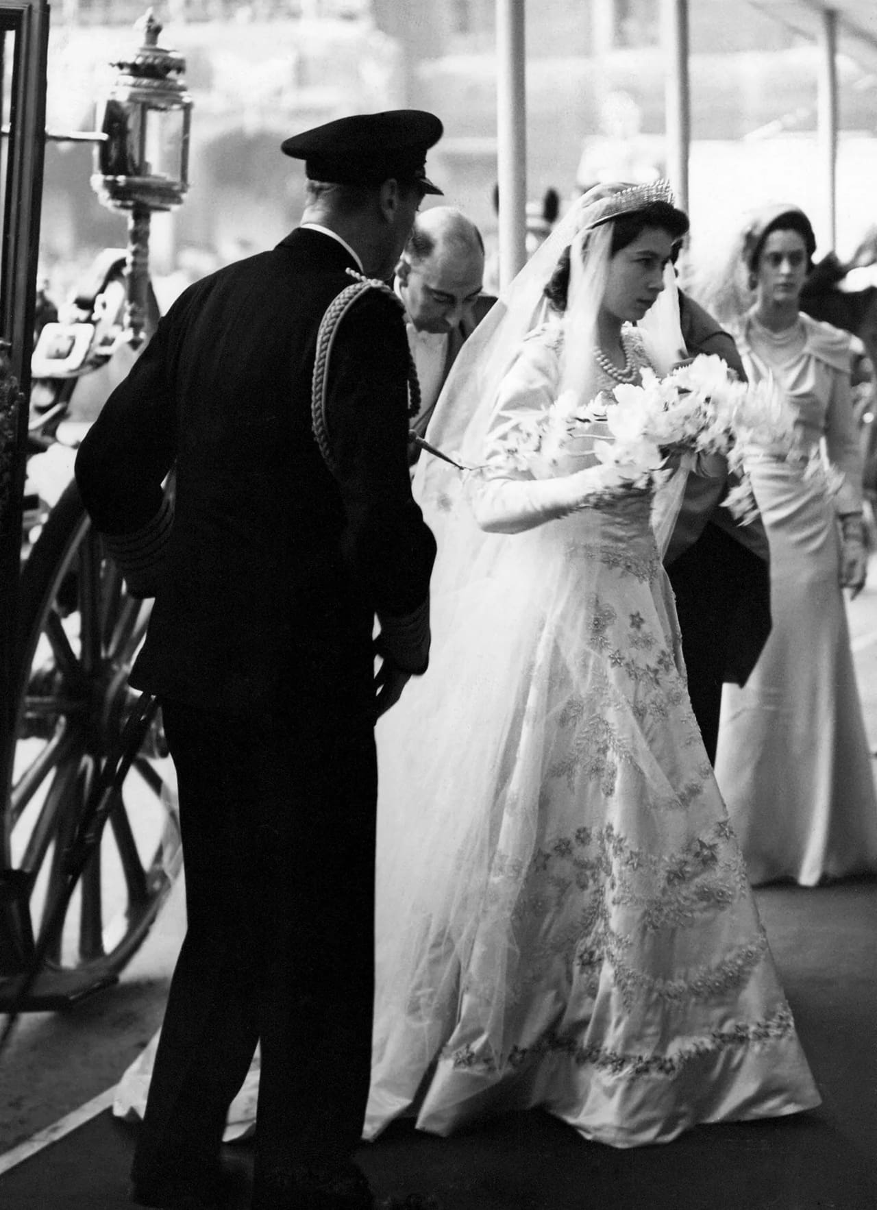 Arriving at Westminster Cathedral with her father, King George, on the morning of her wedding. Tens of thousands of people waited overnight in the freezing cold to catch a glimpse of the bride on the way to the altar. Getty Images