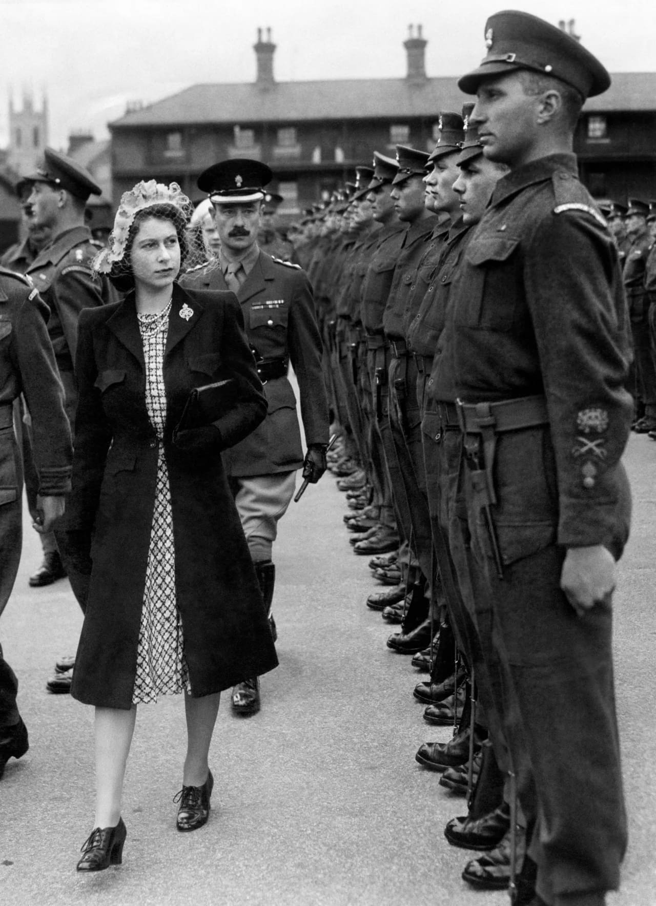 Princess Elizabeth inspecting a training battalion of the Grenadier Guards, of which she was appointed Colonel at the age of 15. Getty Images