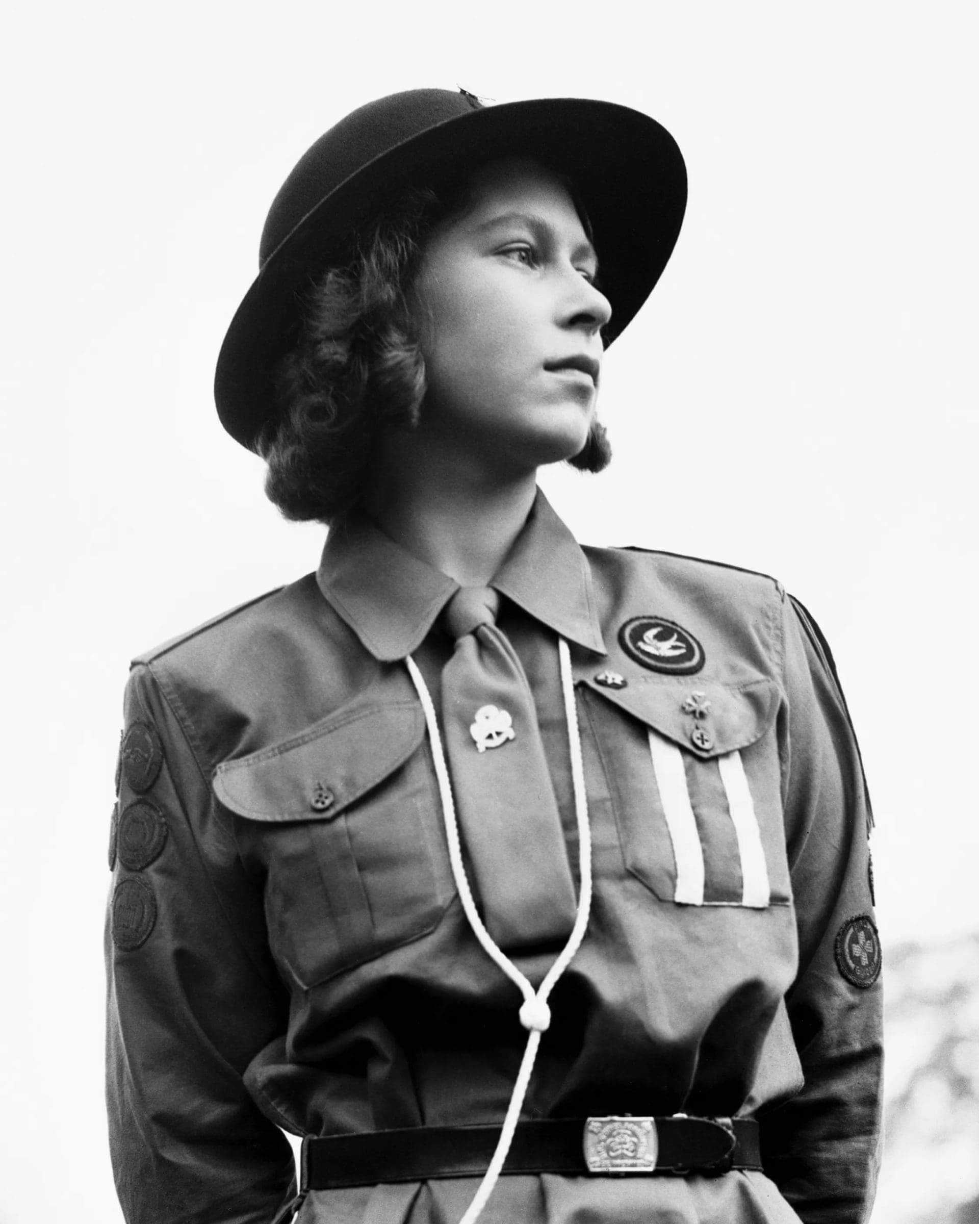 A 16-year-old Princess Elizabeth registering with the Ministry of Labour while wearing her Guides uniform. Getty Images