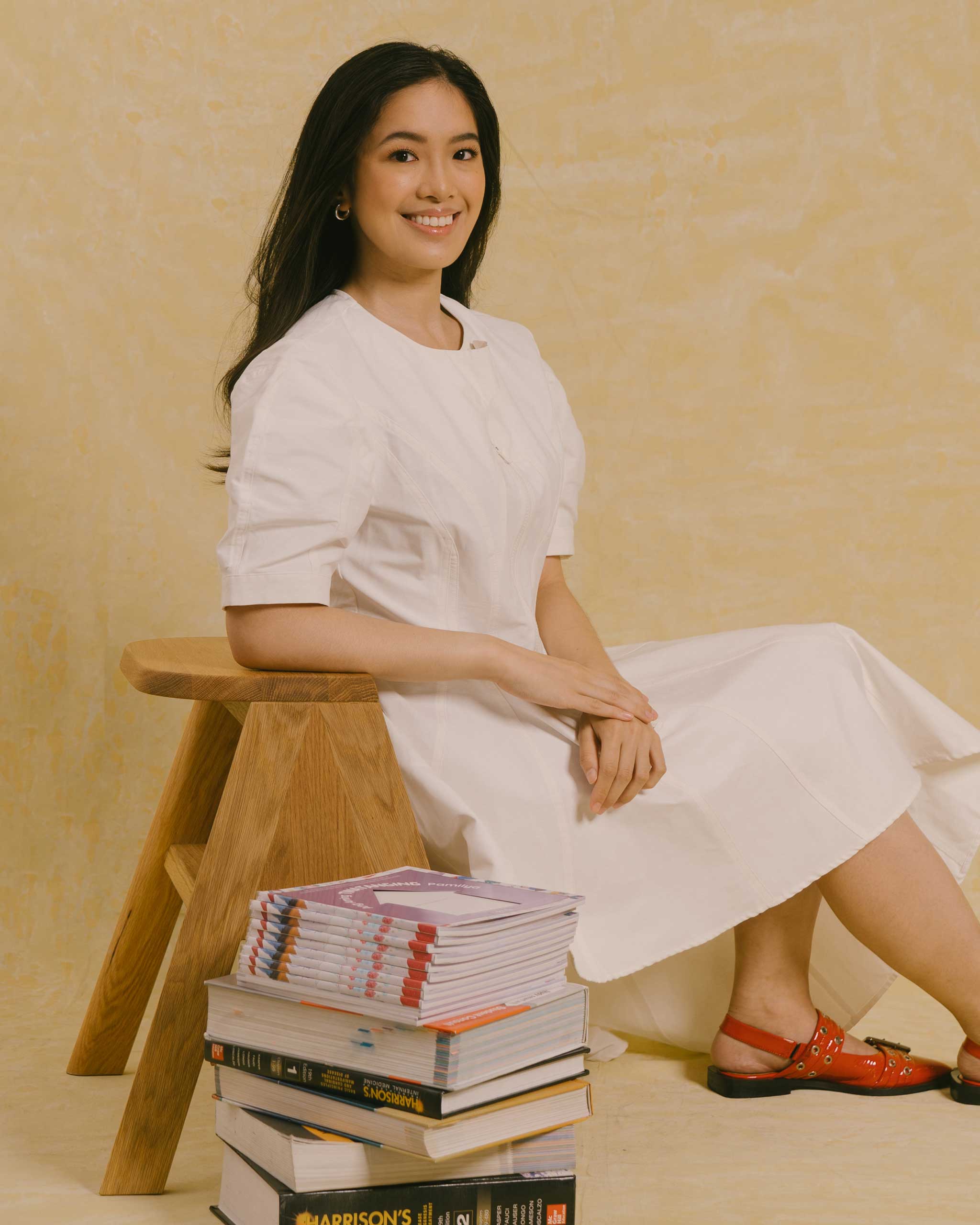 Dr. Celine Guillermo wears Suki Earrings; Urban Revivo dress; Ganni shoes. Photo by Kim Santos, styled by MJ Benitez, hair by Patty Inojales, makeup by Apple Fara-on