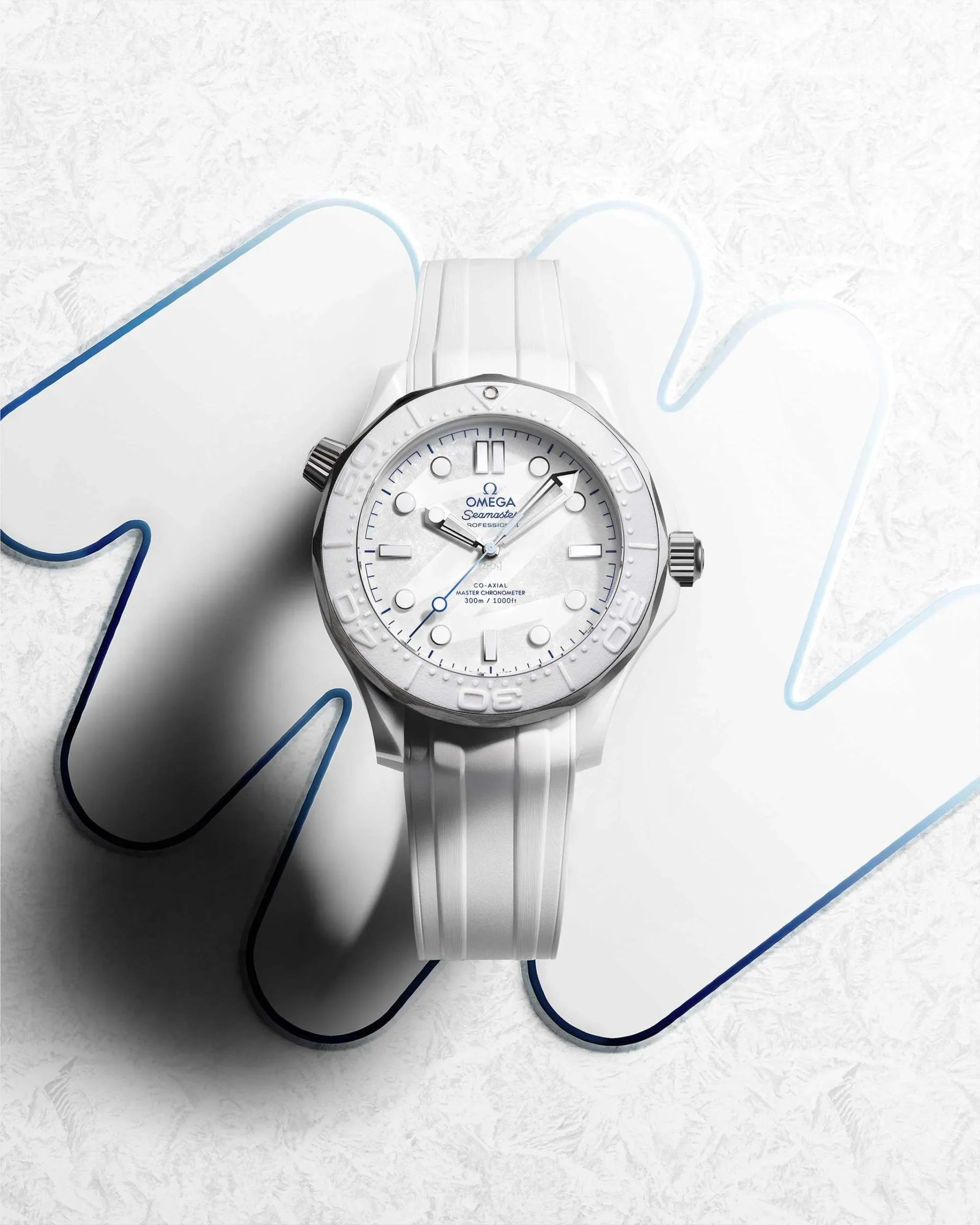 To mark the occasion, OMEGA unveiled the Seamaster Diver 300M, its design inspired by the Milano Cortina 2026 emblem “Futura.” The watch features a minimalist rendering of the number “26,” traced in a single white line across a frosted, misty window. Crafted from white ceramic and titanium, the watch features a polished-and-brushed case, sandblasted crown and helium valve, and a white ceramic bezel, with the Milano Cortina 2026 emblem stamped on the back.