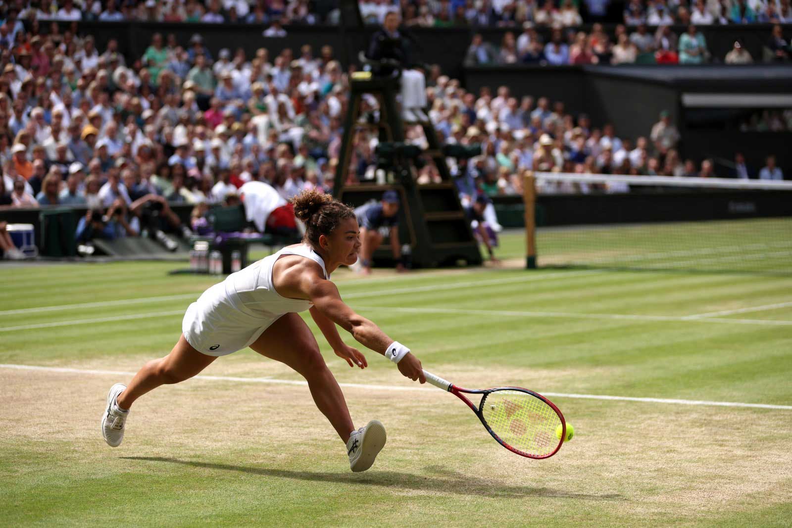 That opening 30 minutes clearly lit a fire: Returning to the grass after a short break, Paolini, gunning to become the first Italian Wimbledon singles champion, played a scorcher of a second set. The seventh seed—who also played in this year’s French Open final, where she lost to Iga Swiatek—completely reset the match, playing with far more control and seizing on Krejčíková’s lapse in focus. A crowd favorite throughout the tournament for her powerful forehand, her dominance at the set, and her effervescent personality, she finally gave the crowd a reason to get involved.
