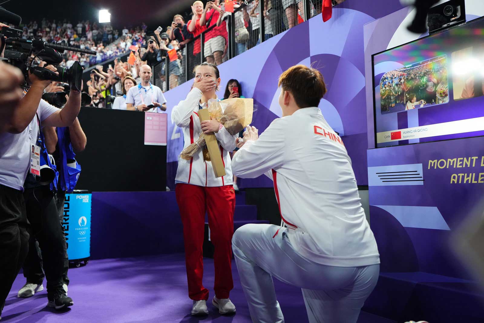 On August 2, shortly after Team China’s Huang Yaqiong won the gold—alongside parner Zheng Siwei—in mixed doubles, Huang’s boyfriend, felllow badminton player Liu Yuchen, became her fiancé: He got down on one knee right after the medal ceremony. “For me, the proposal is very surprising because I have been preparing for the game,” Huang told the press through an interpreter later that day. “Today I am an Olympic champion and I got proposed [to], so that’s something I didn’t expect.”