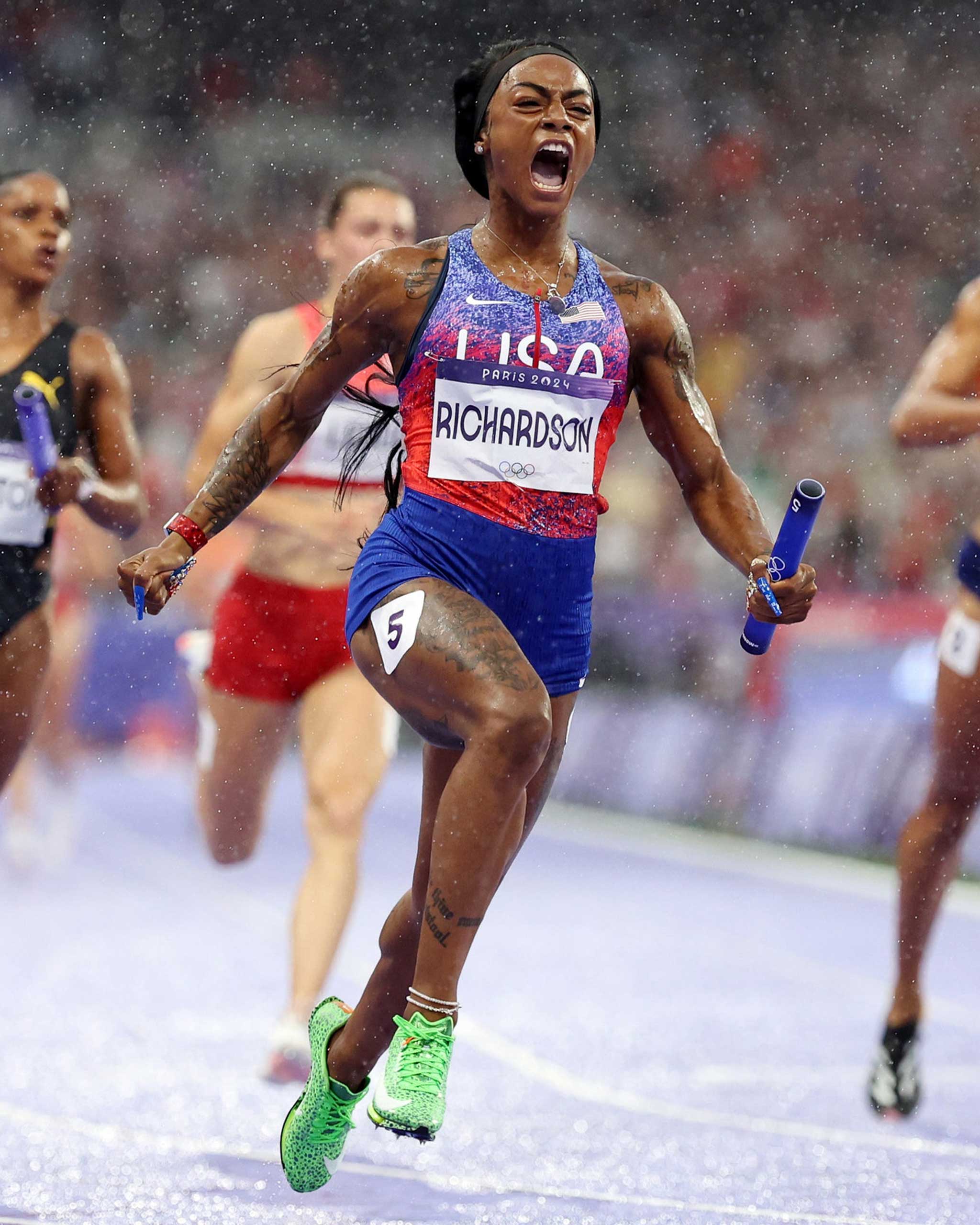 Team USA continued an impressive showing in track and field, with the women winning gold in the 4x100m relay. The participating sprinters were, in order, Melissa Jefferson, Twanisha Terry, Gabby Thomas, and Vogue’s August digital cover star, Sha’Carri Richardson. Though she was behind opponents from Great Britain and Germany upon taking the baton—and despite the rain at Stade de France—Richardson flew by the competition in the anchor leg.