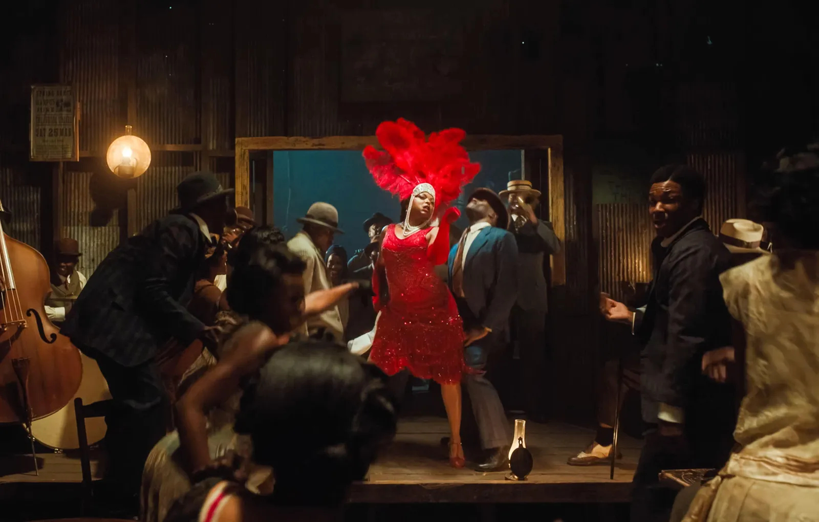 There’s no shortage of eye-popping looks in Blitz Bazawule’s joyous musical, but it’s the Oscar nominated actor’s take on the free-spirited siren Shug Avery that steals the show. As soon as she shimmies into view in her red sequined frock, matching elbow-length gloves and feathered headdress dripping with strings of pearls, you’re captivated.