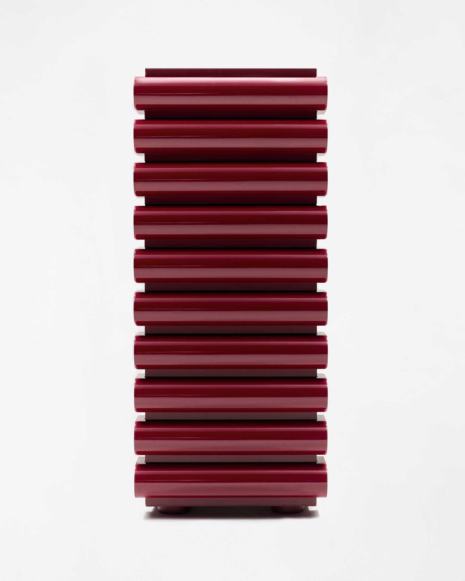 Nanda Vigo’s set of drawers named “Storet” is a collaboration with Acerbis, a Bergamo-based company that is lauded worldwide for its craftsmanship and woodworking traditions. The design is made up of formal and material contrasts, a simple structure with the rounded and sensual shapes of the drawers.