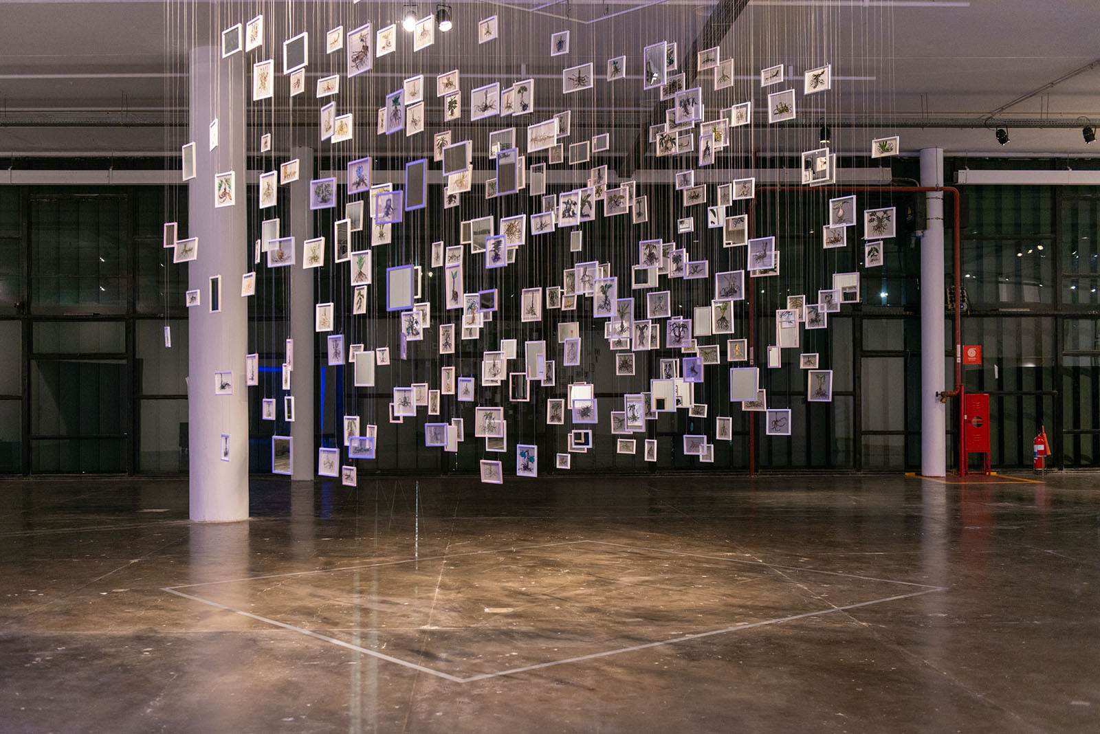 Filipino contemporary artist Geraldine Javier is also exhibiting at the Bienal, with her installations displayed prominently on the second floor. “Oblivious to Oblivion” is a suspended installation made from embroideries of plants and vegetables on silk organza, interspersed with mirrors. “The fleeting reflections of spectators in the small mirrors further insist on an undifferentiated humanity,” describes art critic Carles Guerra for the Bienal, “challenging its deeply rooted antagonism with the natural world.” On a walled chamber behind, her works “Creatures in Search of their Species,” “Insist on Hope, Desist from Despair,” and “New Cloud Forming” are on display.