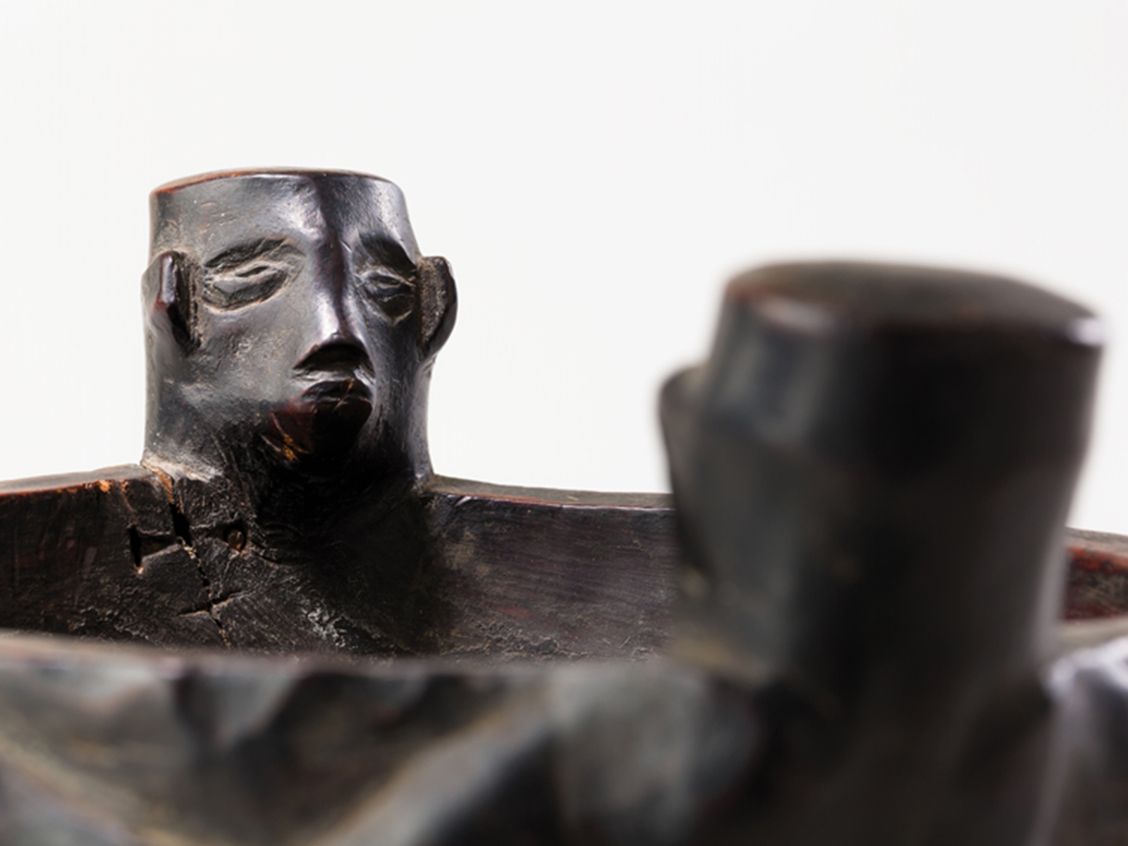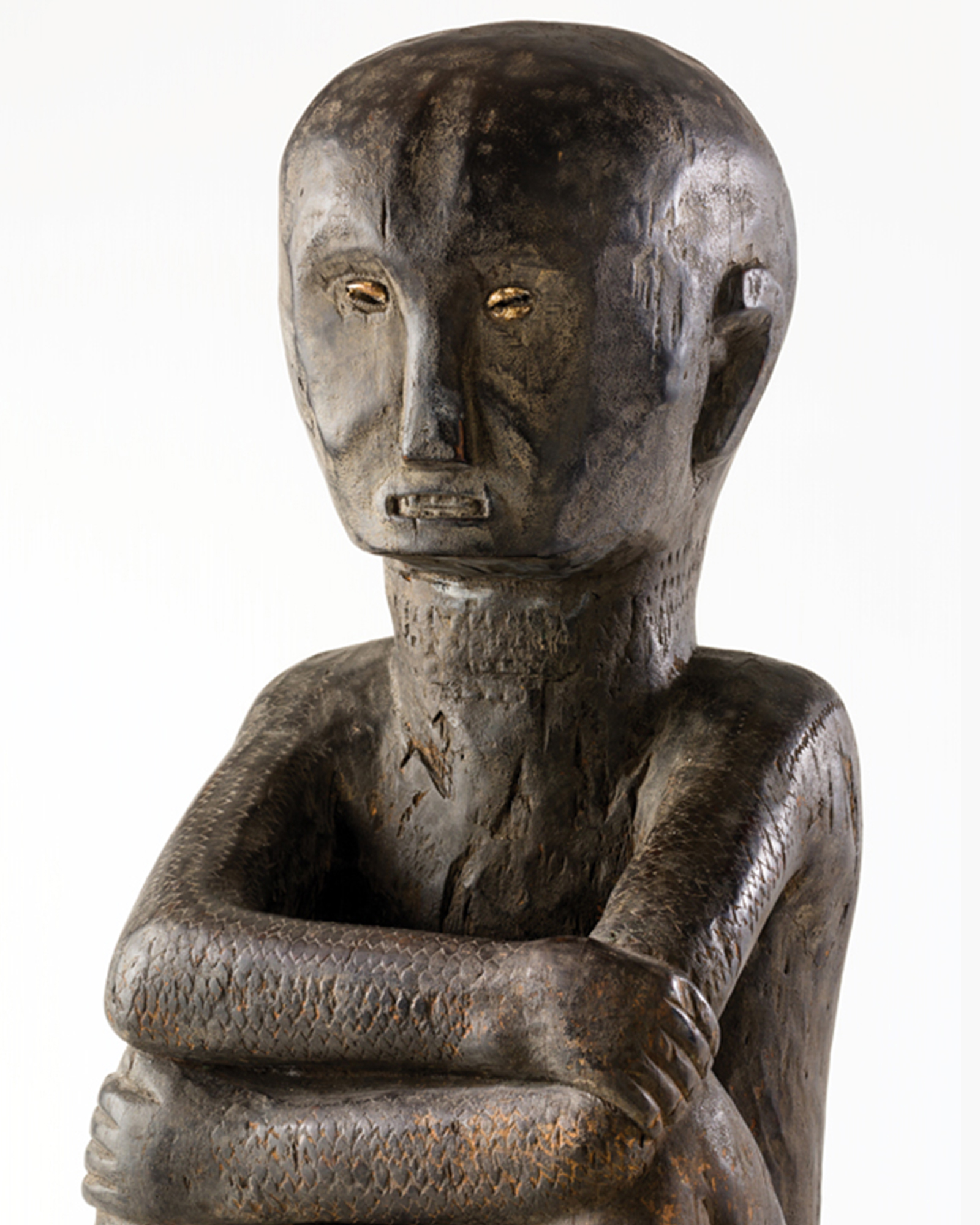 The third one, a Tinagtagu from ca. mid to late 19th-century, is an anthropomorphic sculpture found among the Kankanai people. It is “commissioned when a couple builds their first home” and is highly regarded as a house guardian. Quintos says about this significant piece: “This large and important piece shows all the characteristics of Kankanai sculpture. The torso, arms, and legs are rounded and fleshy, and the face is detailed and made more animated by cowrie shell inlay for eyes.”