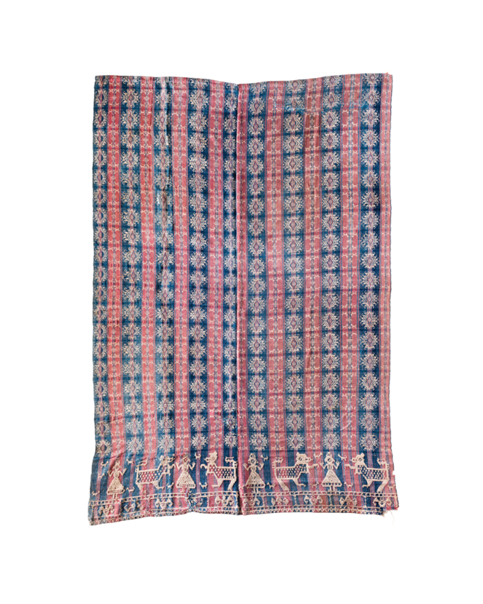 Go purchased the textiles from the shop of Lourdes Dellota, whom Quintos describes as a “legend in the field of Philippine antique dealing.” Quintos narrates that Go found one of the textiles being used as a mantle on a table loaded with santos. “Because of the condition, Roland bought it for a song. I remember him telling me that, in his excitement, he hired a jeepney to bring him to Miag-ao. There, he walked around the town, blanket in hand, asking random locals what they knew about it. His Eureka moment came when he espied, hanging on a clothesline, a near-perfect example which he bought on the spot.”