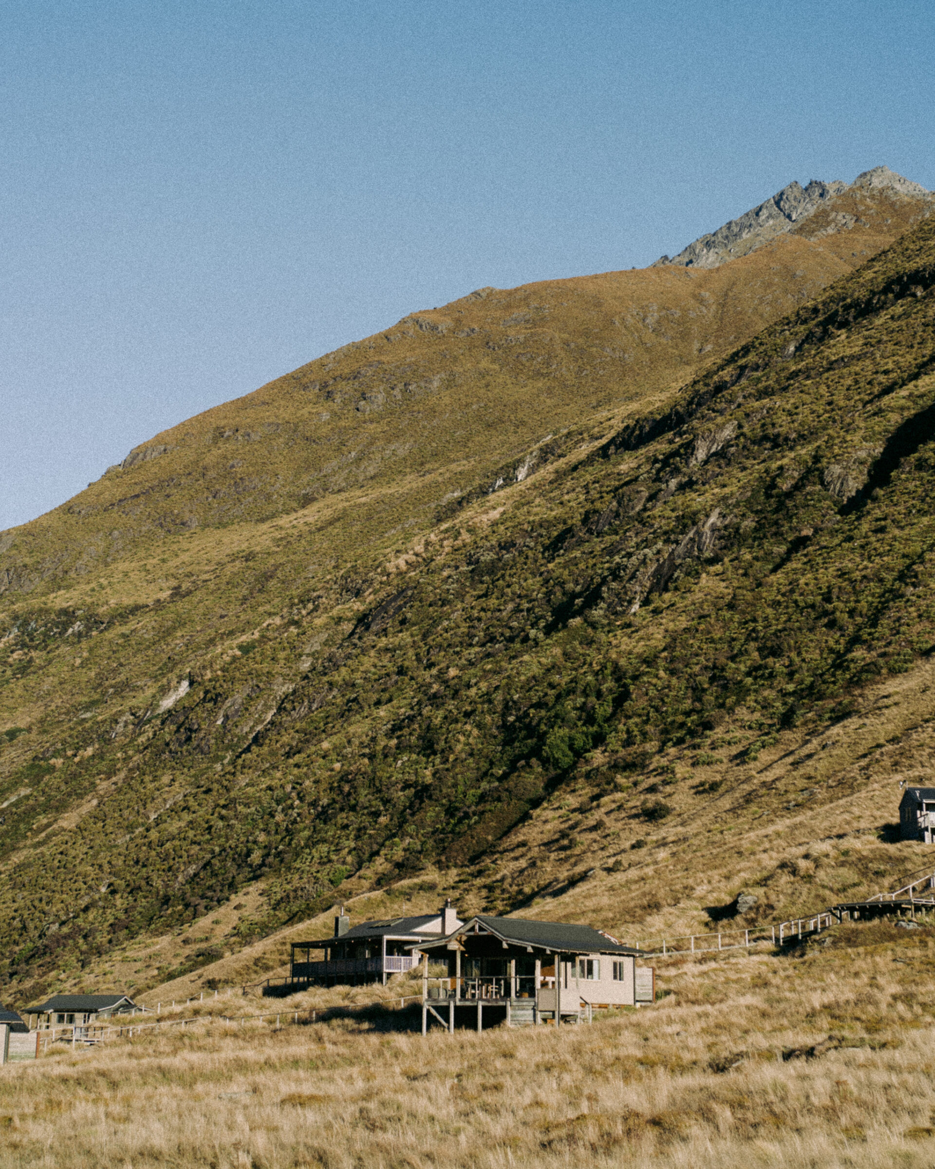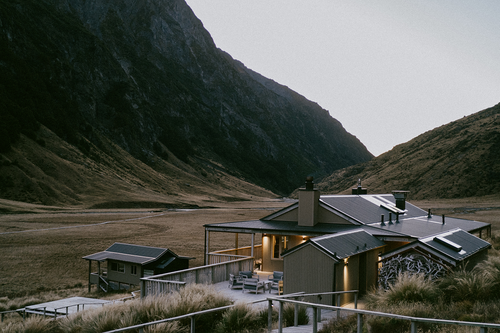 Despite the region’s reputation for adrenaline, only an hour and a half’s drive away is a quieter pace that we have come to experience for ourselves; a single night at Minaret Station Alpine Lodge, hidden deep in a secluded valley. As the story goes, Sir Tim Wallis, a pioneering businessman, aviation enthusiast and beloved son of Wanaka, would often fly through these valleys since the early 1960s, and through his helicopter windows, see the area where the lodge now sits; the same twin waterfalls, streams and sun-flecked ridges. He had to have it, and in 1995, decades after the love affair began, seized the opportunity to execute his deeply-held vision for a luxury lodge and helicopter experiences, when the property became available.
