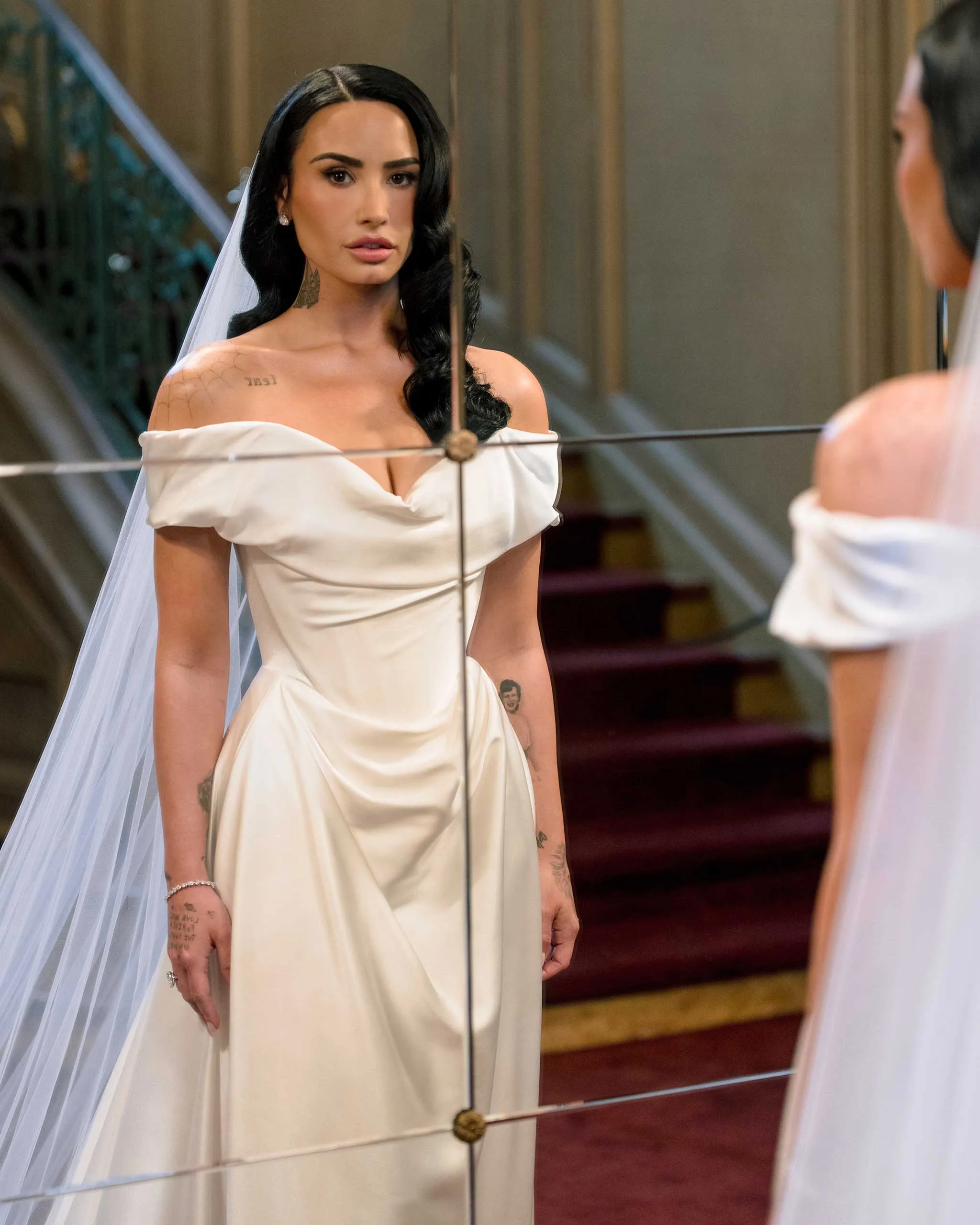 “When I was thinking about [what dress style I wanted] I often found myself coming back to Vivienne’s designs—specifically how the silhouettes really compliment the curves in your body, and her use of corsets,” she added. Demi completed the look with a single tier, custom length cathedral-style veil made from ivory tulle.