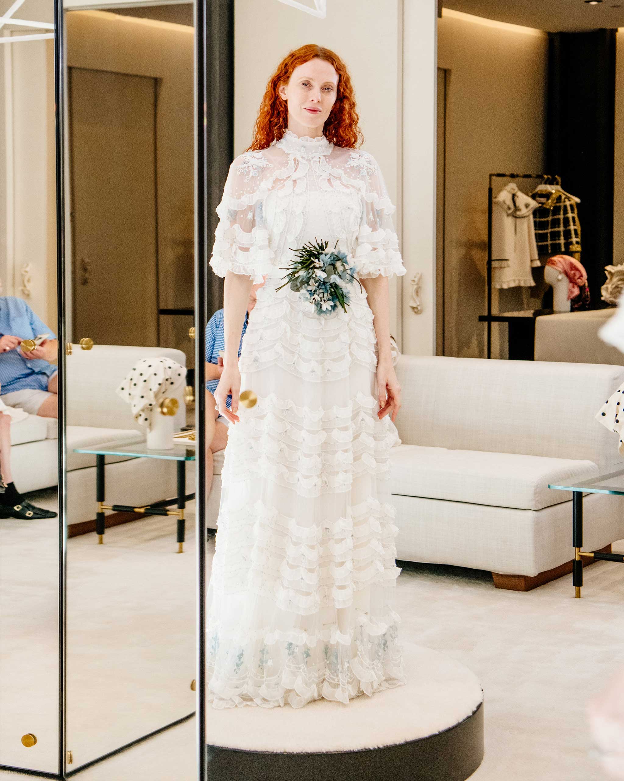 When Karen arrived at the atelier on Thursday to try on the dress and make any potential final alterations before her wedding day, she couldn’t wait for the big reveal. “Should we do the wedding dress first—and get to the exciting part?” she asked before a Valentino associate slid back doors revealing her beautifully embroidered tiered confection of a gown behind them. Karen clapped her hands together with joy and gasped “I’m going to cry!” while smiling from ear to ear.