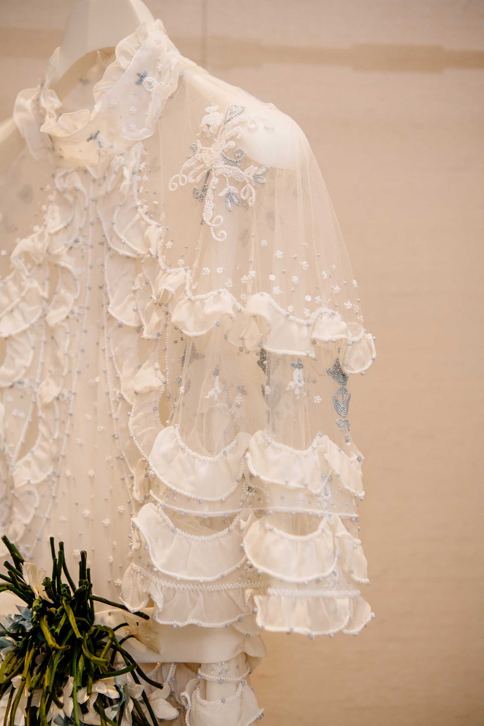 The end result is a full-length dress in embroidered white silk illusion tulle, lined with a layer of light georgette. The celestial blue and ivory embroidery includes beads and shards, while the bodice has a tulle cape with bell sleeves, and the skirt—which is smooth at the waist—opens to flare at the bottom and has an embroidery of raised ruffles joined together on the sides. Finally, the sash at the waist is tied in a bow at the back and features a bouquet motif with flowers—petals and stems—in silk entirely made and painted by hand in the shades of the embroidery.